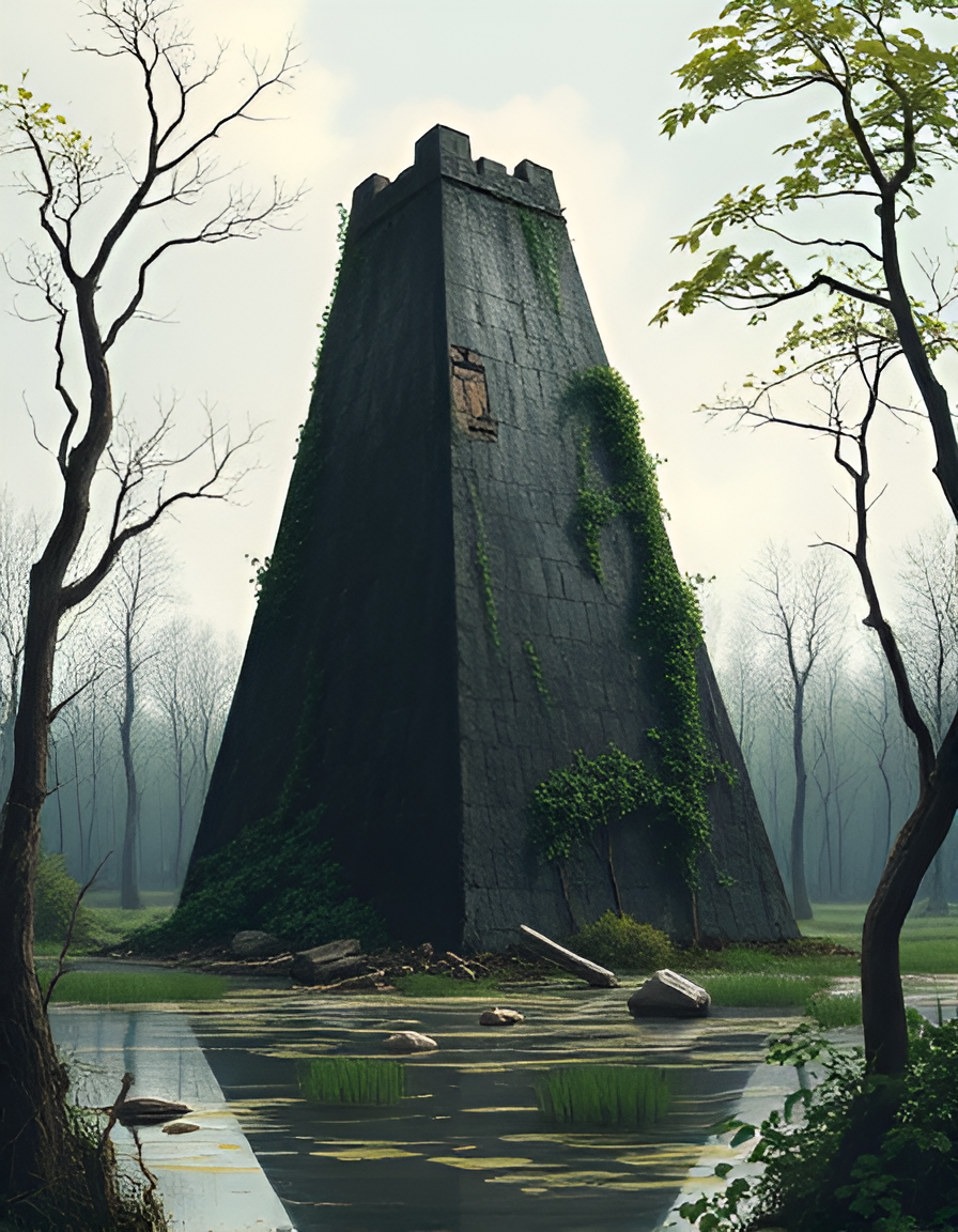 A leaning black triangular tower sinking into a swamp, with vines growing on it. Parts of its walls are broken and there is rubble scattered everywhere. Trees in the foreground and background. In the style of an oil painting.