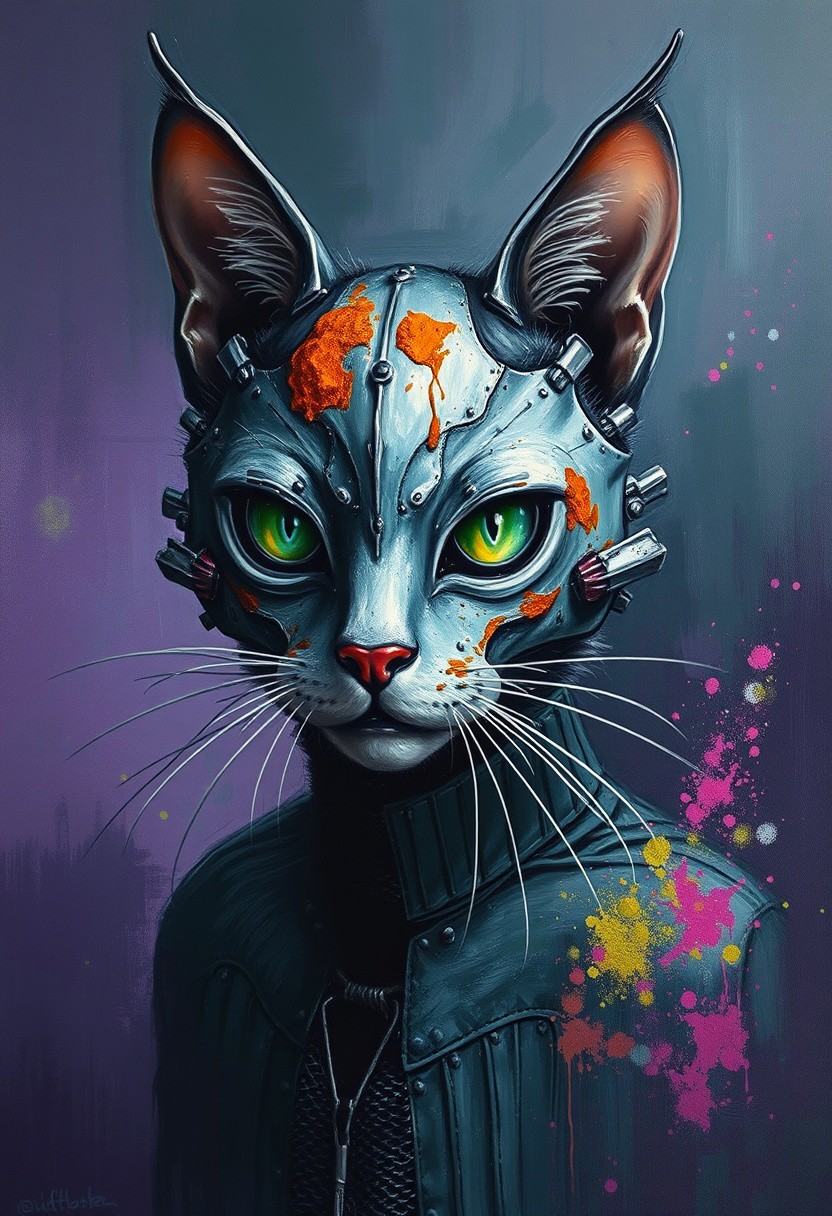 An oil painting in violet, green, black, and white colors, depicting a waist-up portrait of a cat creature with a strange. mix of plastic and metal, giving it a cold, industrial feel. covered with patches of rust, adding an eerie, decayed effect. The cat creature's form is partially obscured by the abstract, textured mask, which contrasts sharply with the background colors. Around the cat creature, vibrant particles of colorful dust float and scatter, adding a surreal and ethereal quality to the scene. The painting captures the eerie and mysterious nature of the cat creature, with the unsettling mask, patches of mold, and swirling dust enhancing its dark, enigmatic presence. <lora:Midjourney_imitation_FLUX:0.5> <lora:aidmaNSFWunlock-PonyStyle:0.5>, In the corner there is a small inscription "fh", like the authoras signature.