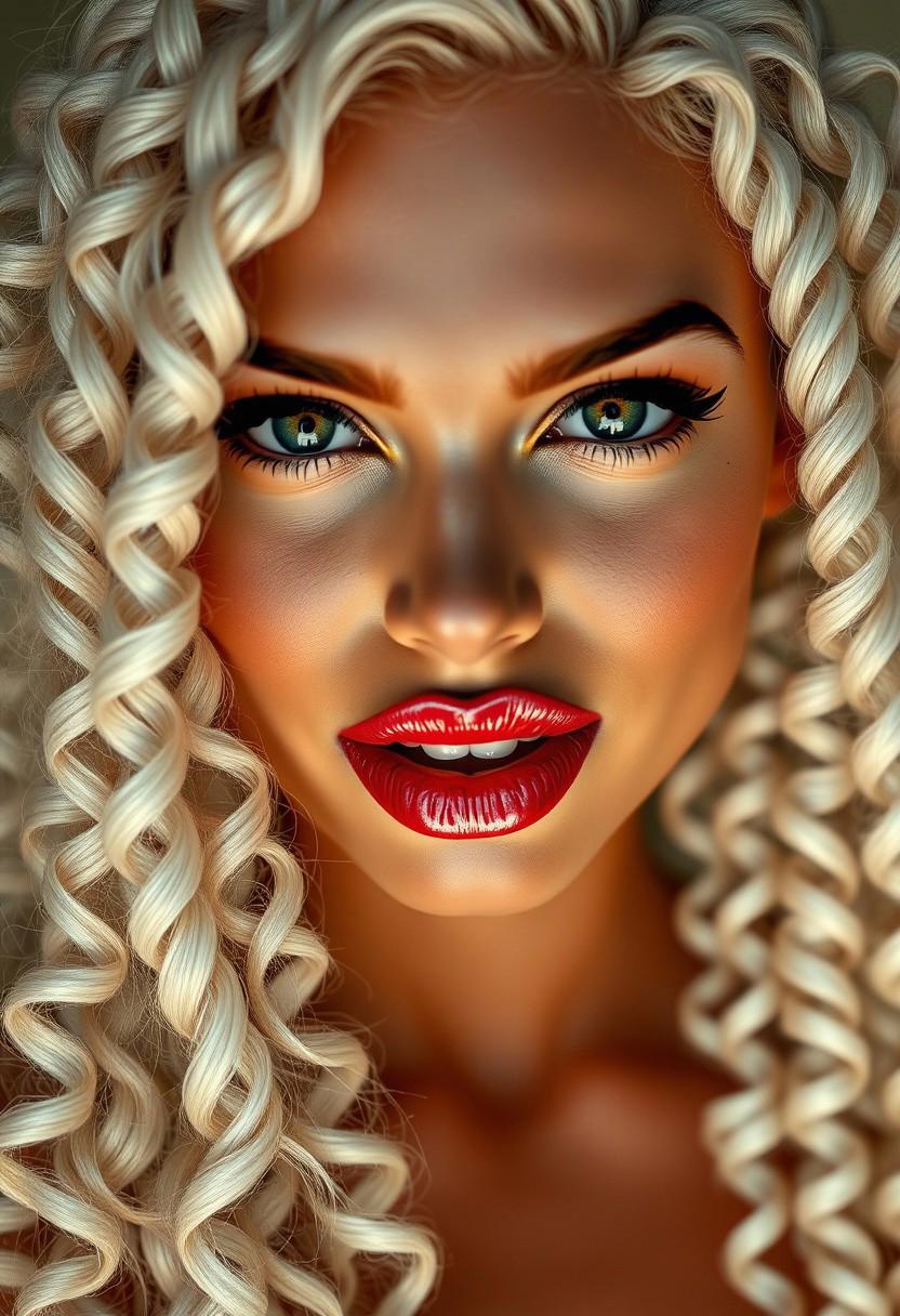 Hyperrealistic glamour portrait of a perfectly beautiful young supermodel, polished porcelain white milky skin, very large very plump full lips, expressive bright eyes, Her expressive soulful look is full of mysterious magnetic charm ((seductive sexy and sultry)), mocking smile with a mocking look, thick white hair covers half of her face with tightly twisted long curls, Professional shooting on a 64 megapixel DSLR camera, Canon telephoto lens, ultra-high quality, superfine textures, (Photorealism, Ultrarealism), (epic), (masterpiece), trend on Artstation, golden ratio, 32k UHD, HDR,
