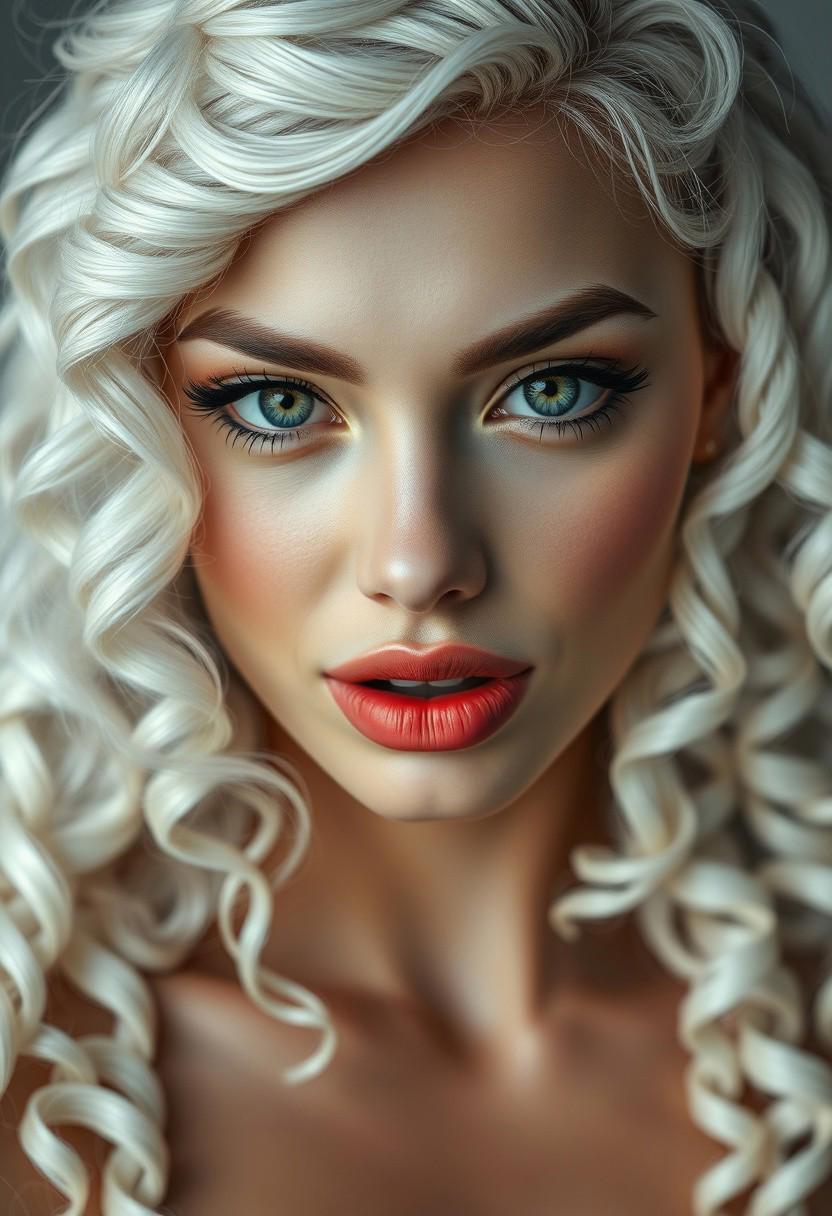 Hyperrealistic glamour portrait of a perfectly beautiful young supermodel, polished porcelain white milky skin, very large very plump full lips, expressive bright eyes, Her expressive soulful look is full of mysterious magnetic charm ((seductive sexy and sultry)), mocking smile with a mocking look, thick white hair covers half of her face with tightly twisted long curls, Professional shooting on a 64 megapixel DSLR camera, Canon telephoto lens, ultra-high quality, superfine textures, (Photorealism, Ultrarealism), (epic), (masterpiece), trend on Artstation, golden ratio, 32k UHD, HDR,