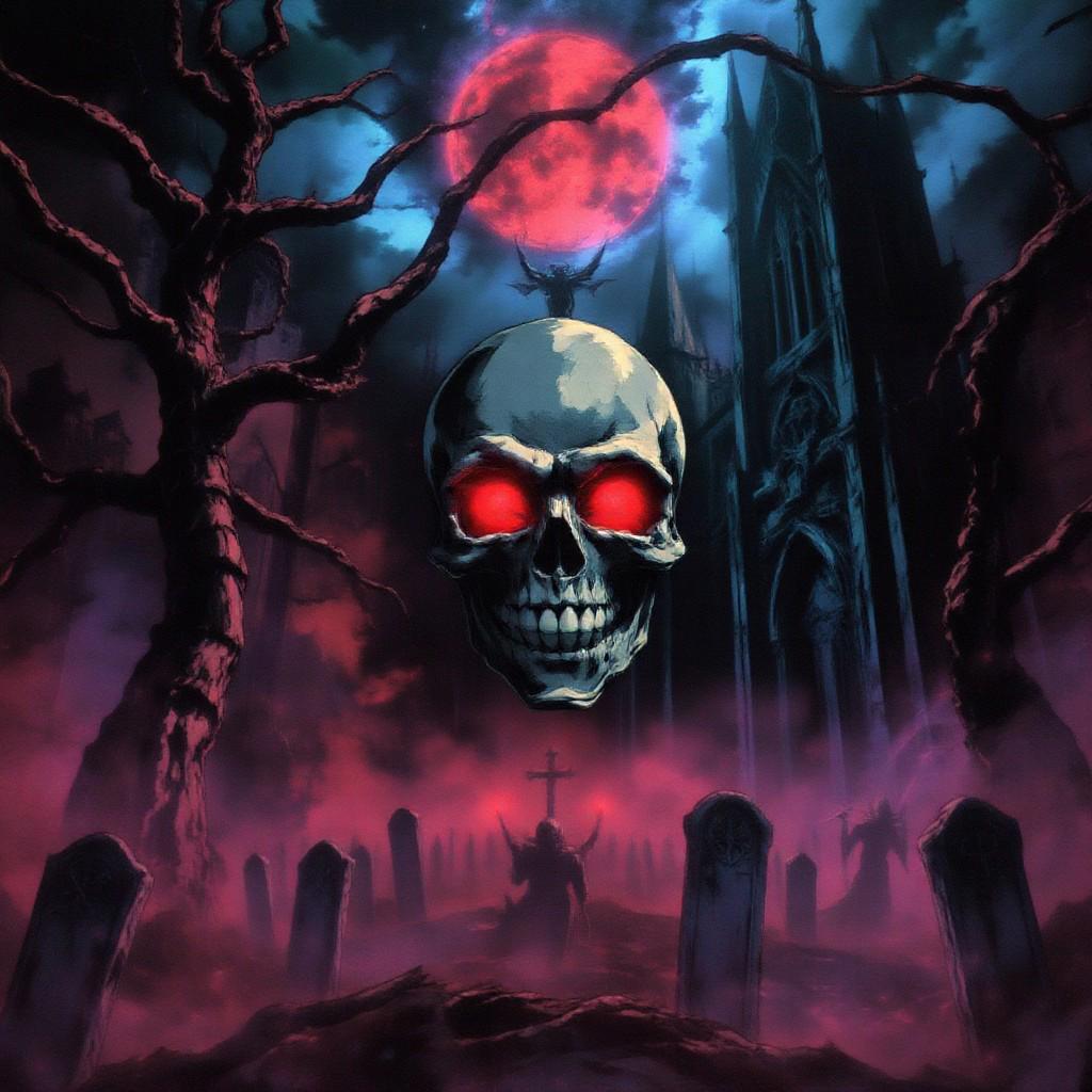 "A profile picture for a user named DoomSkul. The image features a small, menacing skull with glowing red eyes, positioned centrally. The background is the focal point, showcasing a dark, intricate, and eerie gothic fantasy landscape. The scene includes towering skeletal trees with twisted branches, a misty graveyard with ancient, weathered tombstones, and an imposing, crumbling cathedral bathed in shadows and subtle crimson hues. In the background, faint ghostly figures, swirling mist, and magical elements such as glowing runes and ethereal wisps add to the haunting and mystical atmosphere. The overall aesthetic is powerful, mysterious, and hauntingly beautiful, perfectly representing the name DoomSkul.