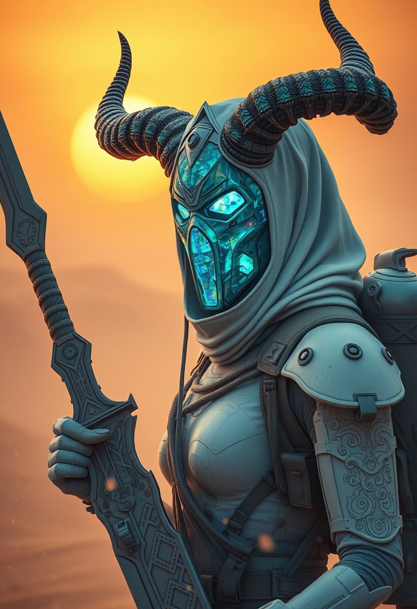 A apoclypse surreal cyberpunk setting under a gritty bleaked beige and blue-turqoise misty desert sunset, a Closeup Portrait of an eerie horned hkgod sci-fi shinobi nun-scout with billowing octopus backpack in a sandstorm, their holographic crystalline mask glinting like shattered rainbows. Iridescent black amber teal energy veins pulse across their form. The atmosphere is thick with heat distortion, glowing particles floating in the air. dark atmospheric lighting, white cybernetic armor. Wielding a massive sss great sword with intricate translucent engravings, hknuns
