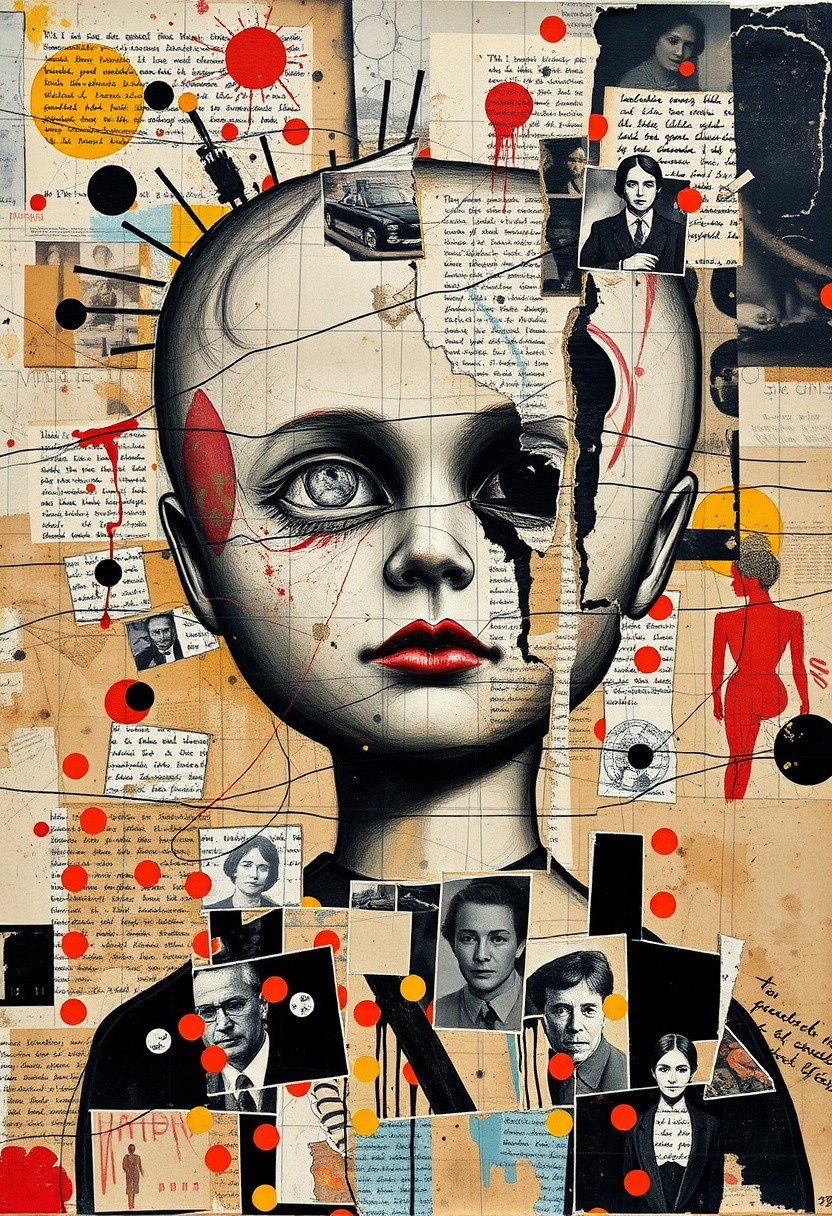 Outsider art. A surreal and deconstructed mixed-media collage in the style of Jacques Prévert with an urgent sense of chaos and energy. An analogue collage artwork blending fragmented styles, layers and textures. A Jean-Michel Basquiat illustration of a broken Victorian china pot doll's head. Layered over this obscuring the image are multiple fragmented and overlapping layers of chaotic thick paint, splatters of paint, palette knife oil paint, handwritten scrawled text messages, torn photographs and broken distorted vintage photographs filling the canvas. Layers sections of repetitive brightly coloured dots in Yayoi Kusama style. Fragmented scribbles and abstract graffiti images in Jean-Michel Basquiat style over the top. This hides sections of the image below. Outlines are roughly redrawn in black ink and thick oil paint. The overall effect is manic and anarchic with an urgent sense of energy.