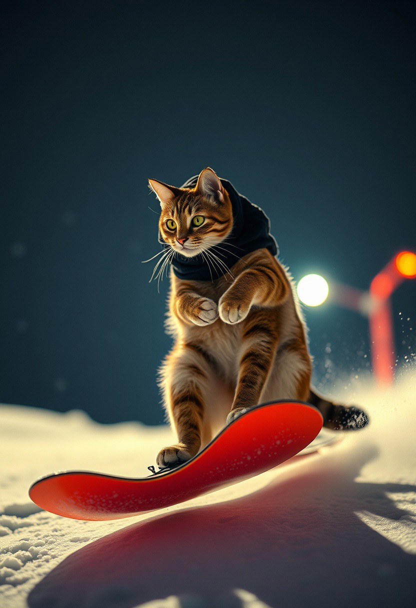 (Soft Lighting Photography by Mimoza Veliu and Mario Giacomelli:1.2), NSFW, A cat competing in snowboarding in Japan snow park, short hair, snow, the cat is executing a snowboard jump, extremely delicate and beautiful art, slow motion, vivid color,