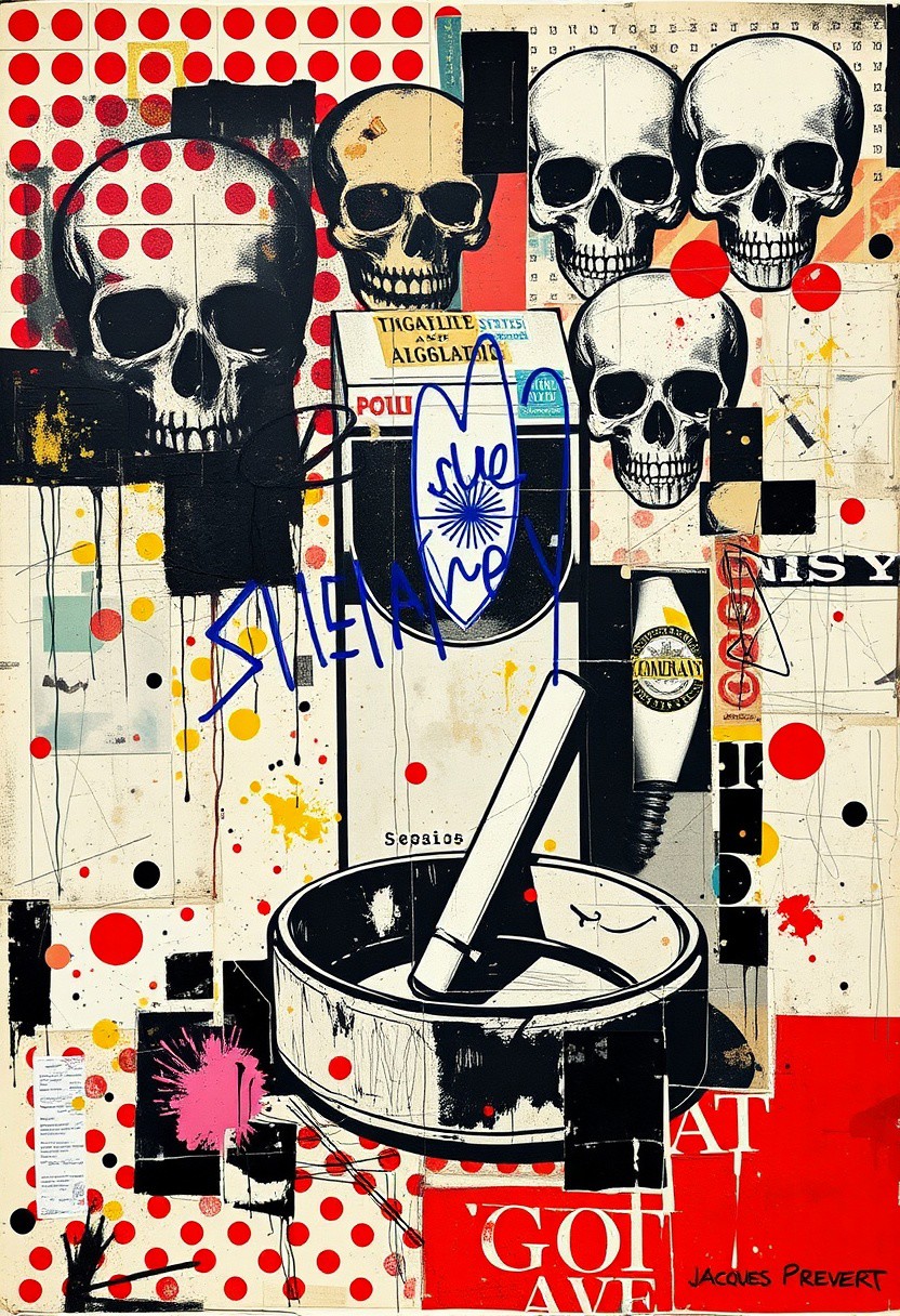 Outsider art. A surreal and deconstructed mixed-media collage in the style of Jacques Prévert with an urgent sense of chaos and energy. An analogue collage artwork blending fragmented styles, layers and textures. The main image is a punk stencil photocopy print of a magazine image of a cigarette packet and ashtray. Print errors, halftone dots. grungy print registration errors. Layered over this obscuring the image are multiple fragmented and overlapping layers of chaotic thick paint, splatters of paint, palette knife oil paint, handwritten scrawled text messages, torn photographs and broken distorted vintage photographs filling the canvas. Layered sections of repetitive brightly coloured dots are spraypainted in Yayoi Kusama style. Fragmented skulls and abstract faces in Jean-Michel Basquiat style over the top. This hides sections of the image below. Outlines are roughly redrawn in black ink and thick oil paint. On the top layer are rough hand-drawn letters and love hearts scrawled heavy-handedly in blue biro on to print. The overall effect is manic and anarchic with an urgent sense of energy.