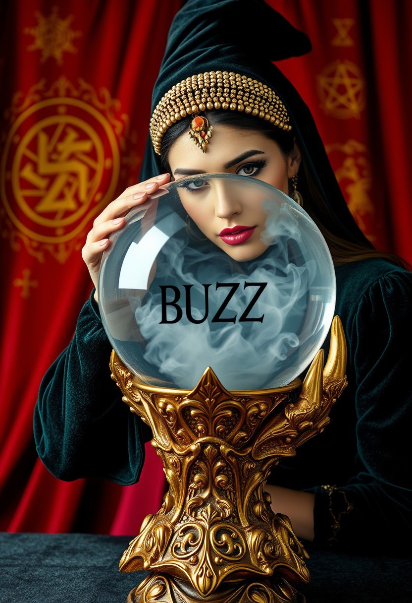 A beautiful witch is peering into a crystal ball on an elaborate gold pedestal in the shape of a dragon's claw. Her flawlessly beautiful face is framed by a intricate beaded headdress and her velvet dress has a high collar framing her face. In the smokey, swirling depths of the crystal ball can be read the word "BUZZ" in gothic letters. The background is an arcane workshop with heavy red velvet drapes embroidered with golden magical symbols. The scene is dark and mysterious and arcane.