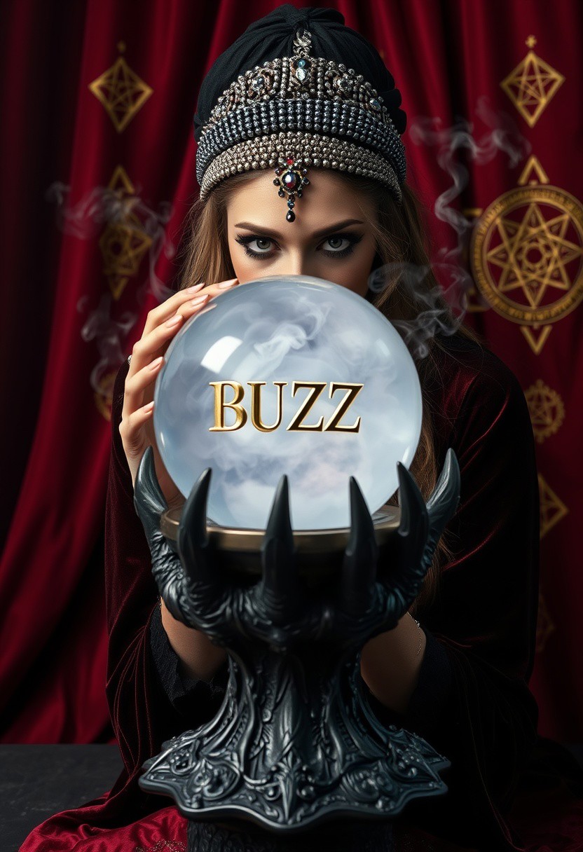 A beautiful witch is peering into a crystal ball on a pedestal in the shape of a dragon's claw.in a demonic hand. Her flawlessly beautiful face is framed by a intricate beaded headdress and her velvet dress has a high collar framing her face. In the smokey, swirling depths of the crystal ball can be read the word "BUZZ" in gothic letters. The background is an arcane workshop with heavy red velvet drapes embroidered with golden magical symbols. The scene is dark and mysterious and arcane.