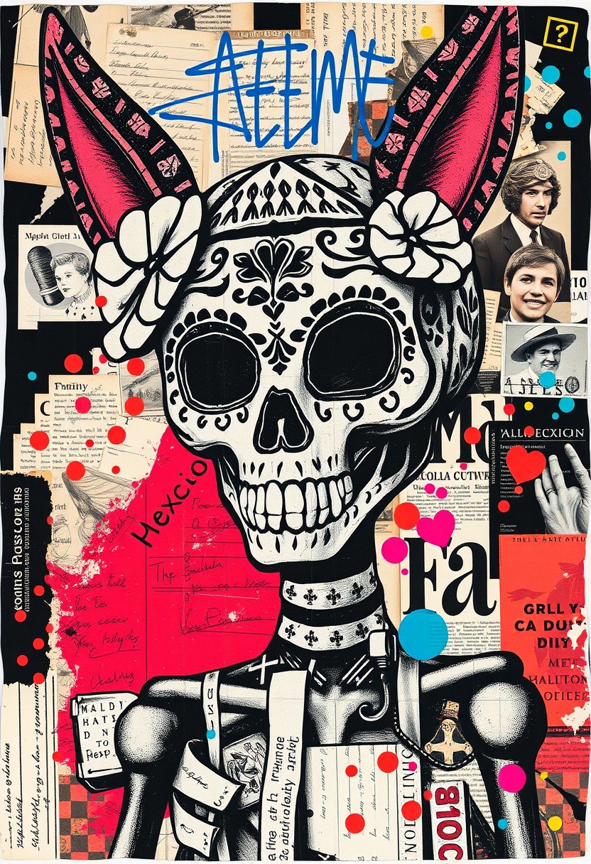 A pop art style mixed media collage artwork. Deconstructed, provocative, surreal, intense and chaotic composition. Street art textures and vibrant retro colours. A punk stencil photocopy print of a magazine image of a Mexican Day of the Dead Alebrije. Print errors, halftone dots. grungy print registration errors, Ben Day dots. Overlaying this are multiple layers of black-and-white Mexican imagery, handwritten letters, bold paint splashes, and chaotic magazine cutouts and clippings. Partially covering this, these break up the outline. Next are layered sections of repetitive brightly coloured dots are spraypainted in Yayoi Kusama style. On top of this are 1950s magazine cutouts and clippings of Mexican luchador wrestlers, and torn vintage holiday postcards with handwritten messages are glued to the layers. This partially hides sections of the images below. On the top layer are rough hand-drawn letters and love hearts scrawled heavy-handedly in blue biro onto print.