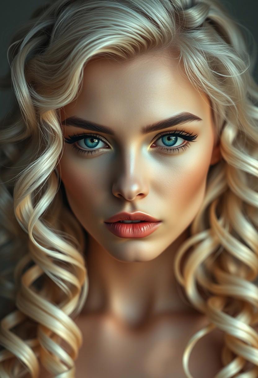 Hyperrealistic glamorous half-length portrait of a perfectly beautiful young supermodel ((seductive sexy and sultry)), ((polished porcelain milky white -s 100 skin)), full very large very plump lips, expressive bright Sapphire Emerald eyes, Her soulful look is full of mysterious magnetic charm, Her thick Pastel White hair in long curls covers half of her face, Professional shooting on a 64 megapixel DSLR camera, Canon telephoto lens, ultra-high quality, superfine textures, (Photorealism, Ultrarealism), (epic), (masterpiece), trend on Artstation, golden ratio, 32k UHD, HDR,