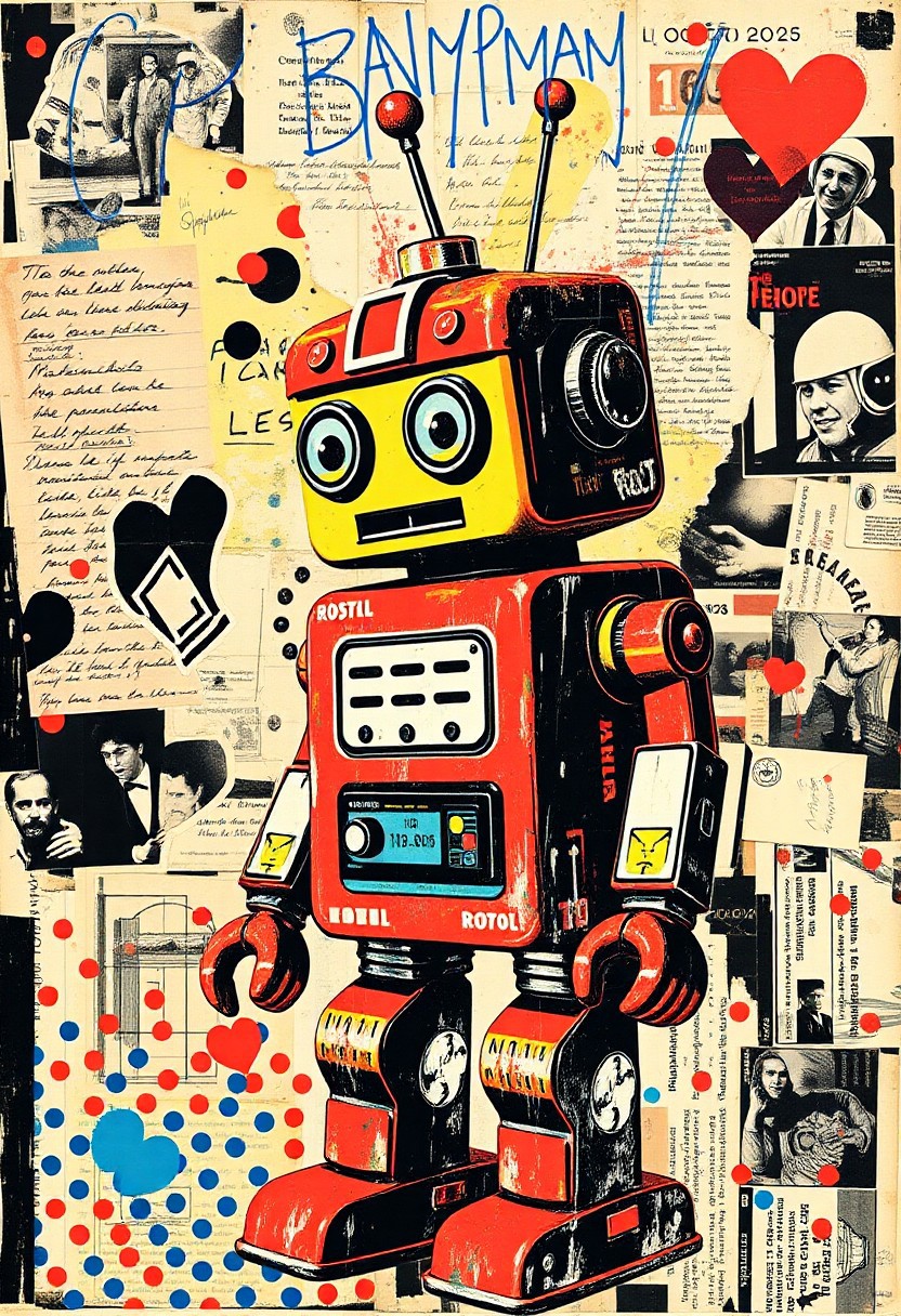 A pop art style mixed media collage artwork. Deconstructed, provocative, surreal, intense and chaotic composition. Street art textures and vibrant retro colours. The main image is a grungy retro stencil screenprint of a colourful 1960s toy tin robot with electricity. Print errors, halftone dots. grungy print registration errors, Ben Day dots. Overlaying this are multiple layers of black-and-white Mexican imagery, handwritten letters, bold paint splashes, and chaotic magazine cutouts and clippings. Partially covering this, these break up the outline. Next are layered sections of repetitive brightly coloured dots are spraypainted in Yayoi Kusama style. On top of this are 1950s magazine cutouts and clippings of space travel and astronauts, and torn vintage postcards with handwritten messages are glued to the layers. This partially hides sections of the images below. On the top layer are rough hand-drawn letters and love hearts scrawled heavy-handedly in blue biro onto print.