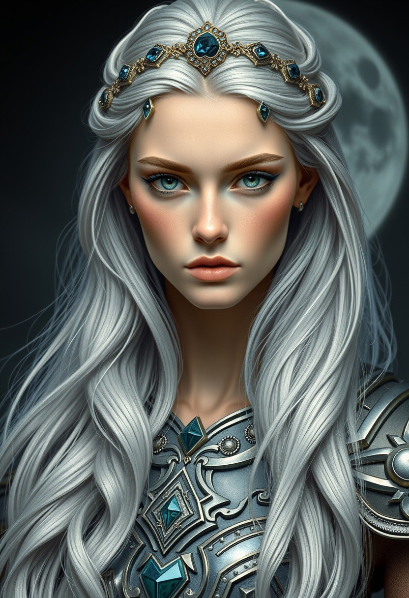 A 20-year-old female goddess with long, flowing silver hair resembling moonlit cascades, adorned with a delicate, gemstone-encrusted circlet, her elegant face showcasing a serene yet powerful visage, with profound, piercing emerald eyes that seem to hold the wisdom of the ages. Her features, a masterful blend of classical Greek and Norse inspirations, exude an aura of intelligence, confidence, and unyielding strength, tempered by a deep sense of compassion and wisdom. She wears an intricately crafted, modernized suit of armor, a mesmerizing fusion of ancient,