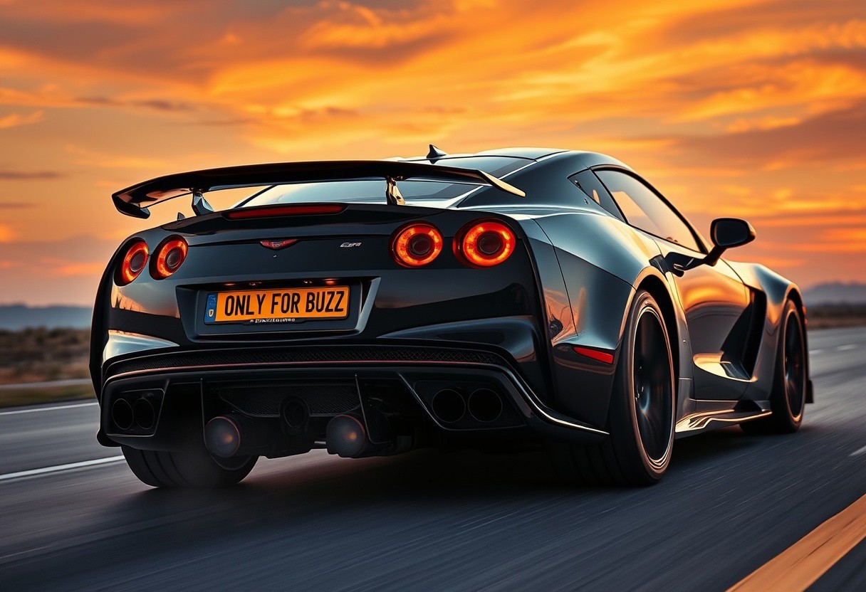 “A high-performance sports car seen from the back, exuding power and speed. The sleek design features aggressive aerodynamics, wide tires, and distinctive tail lights. The license plate boldly reads ‘I BRAKE ONLY FOR BUZZ.’ The car is in motion on an open highway at dusk, with motion blur enhancing the sense of speed. The exhaust emits a faint glow, hinting at raw horsepower. The background showcases a dramatic sky with deep oranges and purples, adding to the cinematic feel. Ultra-realistic reflections on the car’s glossy surface and intense lighting make the scene striking and dynamic.”
