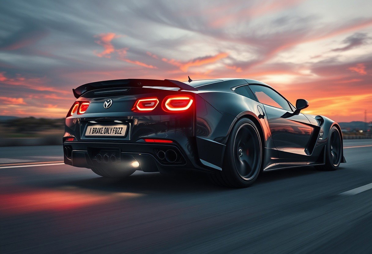 “A high-performance sports car seen from the back, exuding power and speed. The sleek design features aggressive aerodynamics, wide tires, and distinctive tail lights. The license plate boldly reads ‘I BRAKE ONLY FOR BUZZ.’ The car is in motion on an open highway at dusk, with motion blur enhancing the sense of speed. The exhaust emits a faint glow, hinting at raw horsepower. The background showcases a dramatic sky with deep oranges and purples, adding to the cinematic feel. Ultra-realistic reflections on the car’s glossy surface and intense lighting make the scene striking and dynamic.”