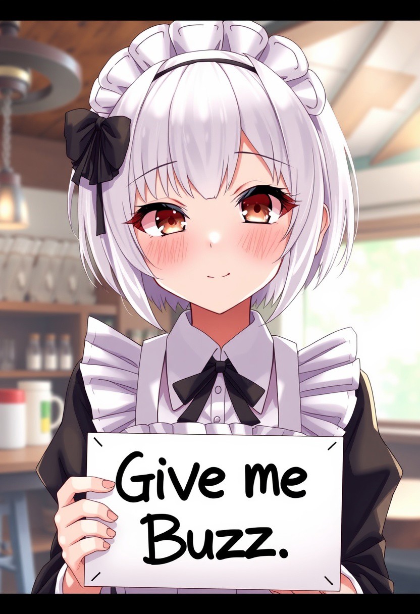 score_4,score_5,score_6,score_7_up,score_8_up,score_9 ((masterpiece,best quality,ultra detailed,highres,HD,4k:1.2)), 1 girl,solo,face focus, white hair,short hair,bob cut,sidelocks,brown eyes, Maid headband, maid apron, maid outfit, frilly apron, indoors,cafe, maid costume,maid school, (("Give me Buzz.",Beggars Borad,Holding a sign, holding a sign that says, "Give me Buzz.")) wink,happy,blush, looking at viewer, smile,,