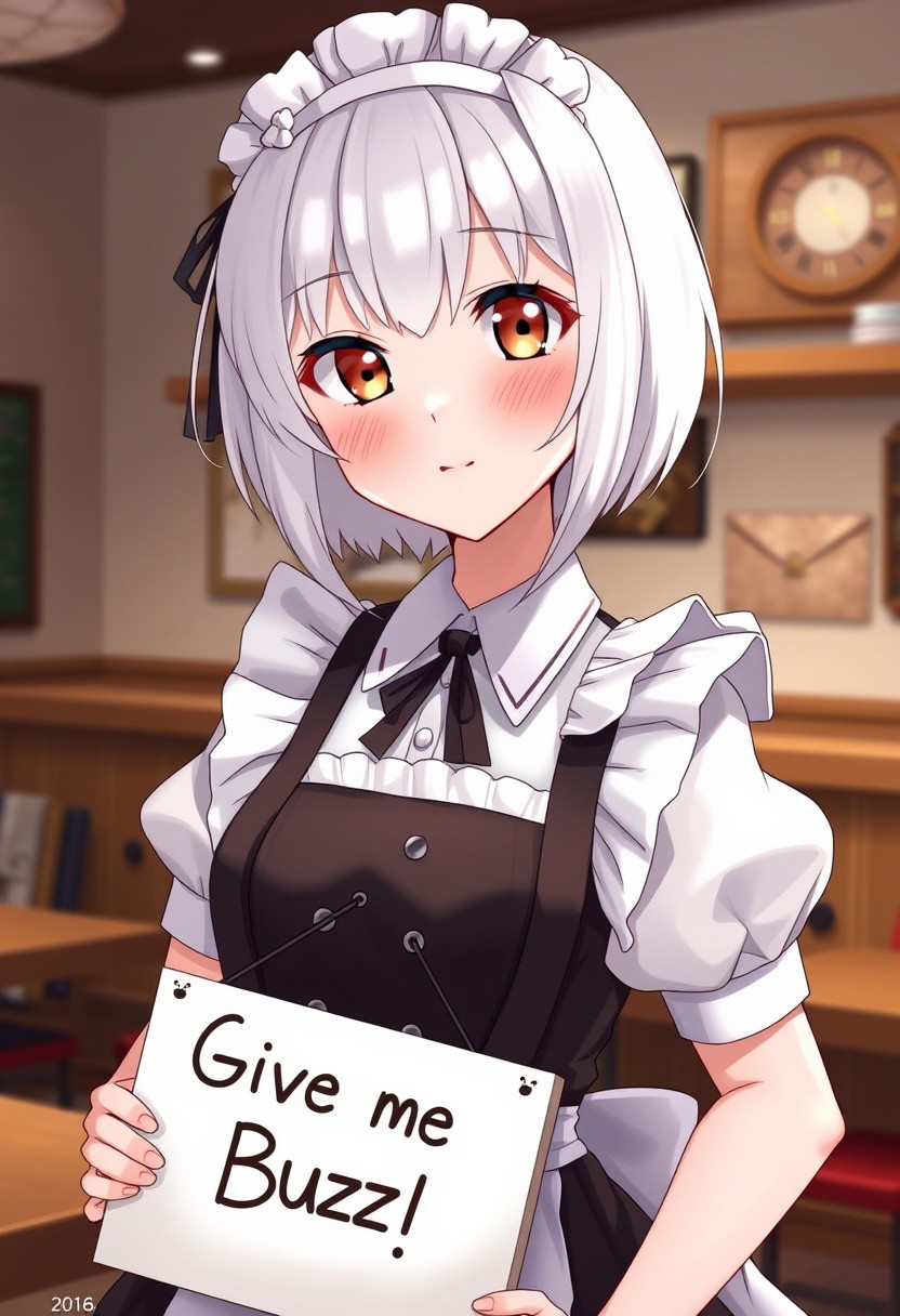 score_4,score_5,score_6,score_7_up,score_8_up,score_9 ((masterpiece,best quality,ultra detailed,highres,HD,4k:1.2)), 1 girl,solo,face focus, white hair,short hair,bob cut,sidelocks,brown eyes, Maid headband, maid apron, maid outfit, frilly apron, indoors,cafe, maid costume,maid school, (("Give me Buzz.",Beggars Borad,Holding a sign, holding a sign that says, "Give me Buzz.")) wink,happy,blush, looking at viewer, smile,,