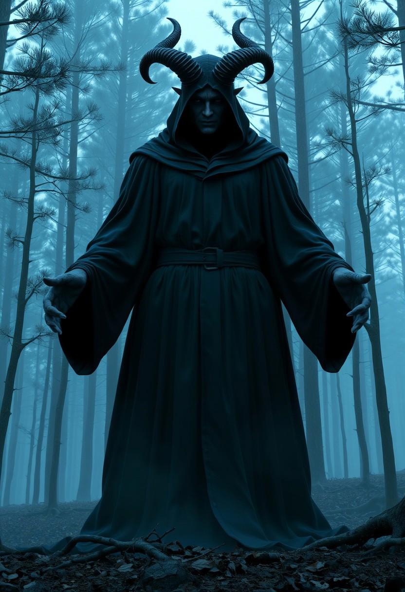 This is a highly detailed CGI (computer-generated imagery) scene depicting a dark, mystical forest bathed in a bluish, foggy light. The central figure is a towering, imposing figure dressed in a long, flowing black cloak with a belt at the waist, reminiscent of medieval or gothic attire. The figure's face is partially obscured by a hood, but the eyes and nose are visible, giving a sinister yet captivating expression. The figure's most striking feature is its large, curved black horns that protrude from the head, adding to the demonic appearance. The figure's arms are outstretched, palms facing outward, as if beckoning or commanding. The forest background is dense with tall, thin pine trees, their branches reaching up into the misty sky. The ground is covered in a layer of fallen leaves and roots, adding to the eerie atmosphere. The overall color palette is dark and muted, with shades of black, grey, and blue dominating the scene. The image has a high level of realism in its textures, from the rough bark of the trees to the soft fabric of the cloak, creating a hauntingly beautiful and ominous visual experience.