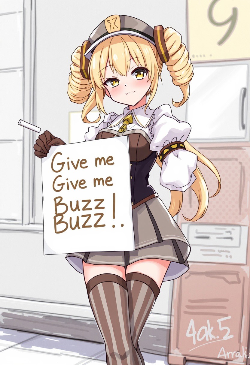 score_4,score_5,score_6,score_7_up,score_8_up,score_9 ((masterpiece,best quality,ultra detailed,highres,HD,4k:1.2)), Araki,sketch, mami tomoe, blonde hair, drill hair, twin drills, yellow eyes,large breasts, brown gloves, corset, detached sleeves, fingerless gloves, gloves, hat, juliet sleeves, long sleeves, magical girl, puffy sleeves, skirt, striped, striped thighhighs, thighhighs, thighs, vertical stripes, vertical-striped thighhighs, outdoors, (("Give me Buzz.",Beggars Borad,Holding a sign, holding a sign that says, "Give me Buzz.")) wink,happy,blush, looking at viewer, smile,,