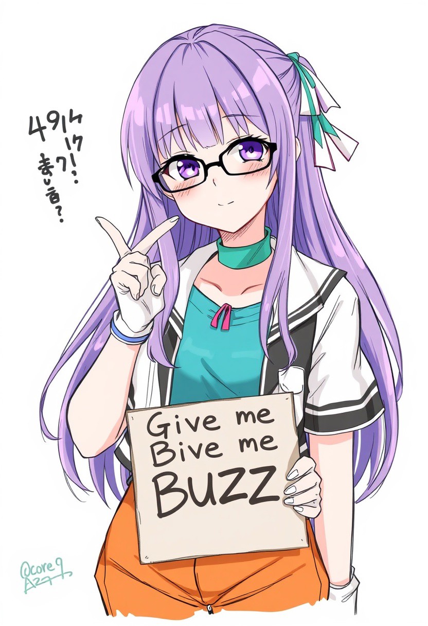score_4,score_5,score_6,score_7_up,score_8_up,score_9 ((masterpiece,best quality,ultra detailed,highres,HD,4k:1.2)), 1 girl,solo,face focus, Araki,sketch, aayuamu, long hair, multicolored hair, hair ribbon, glasses, purple eyes, small breasts, aqua choker, aqua shirt, cropped jacket, white jacket, short sleeves, white gloves, clothes around waist, orange pants, (("Give me Buzz.",Beggars Borad,Holding a sign, holding a sign that says, "Give me Buzz.")) wink,happy,blush, looking at viewer, smile,
