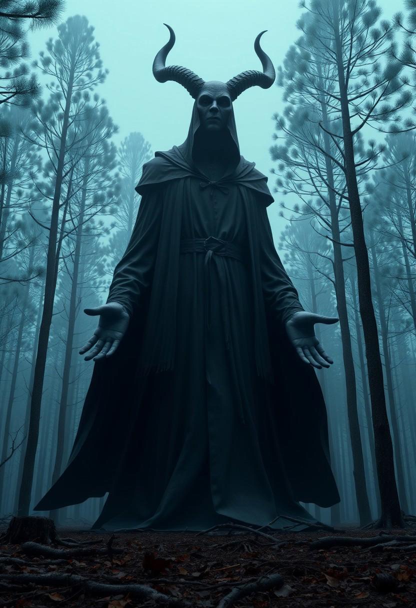 This is a highly detailed CGI (computer-generated imagery) scene depicting a dark, mystical forest bathed in a bluish, foggy light. The central figure is a towering, imposing figure dressed in a long, flowing black cloak with a belt at the waist, reminiscent of medieval or gothic attire. The figure's face is partially obscured by a hood, but the eyes and nose are visible, giving a sinister yet captivating expression. The figure's most striking feature is its large, curved black horns that protrude from the head, adding to the demonic appearance. The figure's arms are outstretched, palms facing outward, as if beckoning or commanding. The forest background is dense with tall, thin pine trees, their branches reaching up into the misty sky. The ground is covered in a layer of fallen leaves and roots, adding to the eerie atmosphere. The overall color palette is dark and muted, with shades of black, grey, and blue dominating the scene. The image has a high level of realism in its textures, from the rough bark of the trees to the soft fabric of the cloak, creating a hauntingly beautiful and ominous visual experience.