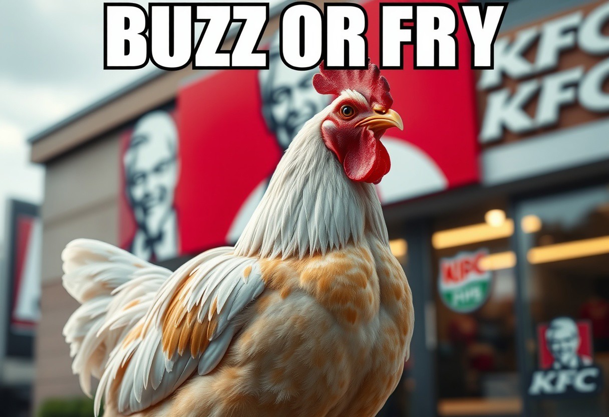“A realistic, detailed chicken standing confidently in front of a KFC restaurant. The chicken has bright feathers, a sharp gaze, and a proud stance as if aware of its surroundings. The KFC logo is visible in the background, slightly blurred for depth. The scene is captured in a cinematic style with balanced lighting, slightly warm tones, and a shallow depth of field. Overlay bold white text with a black outline in meme style at the top: ‘BUZZ OR FRY’.”