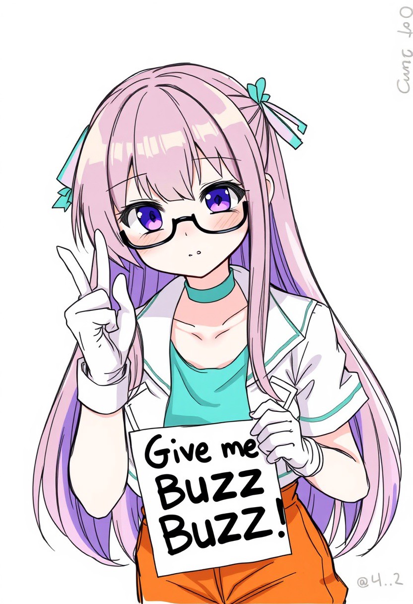 score_4,score_5,score_6,score_7_up,score_8_up,score_9 ((masterpiece,best quality,ultra detailed,highres,HD,4k:1.2)), 1 girl,solo,face focus, Araki,sketch, aayuamu, long hair, multicolored hair, hair ribbon, glasses, purple eyes, small breasts, aqua choker, aqua shirt, cropped jacket, white jacket, short sleeves, white gloves, clothes around waist, orange pants, (("Give me Buzz.",Beggars Borad,Holding a sign, holding a sign that says, "Give me Buzz.")) wink,happy,blush, looking at viewer, smile,