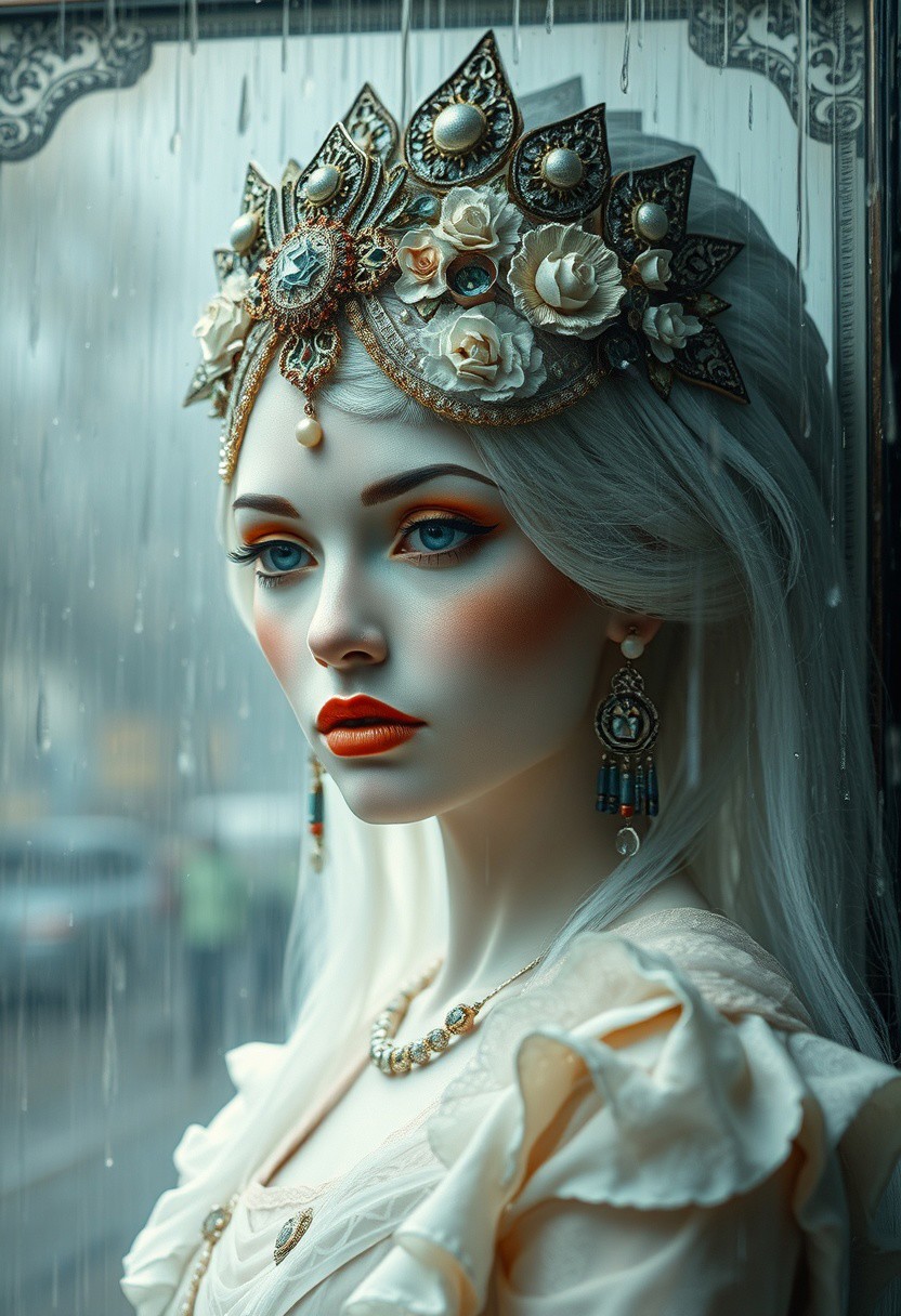 Wet rainy scene, layered papier-mâché material. Art Nouveau framed portrait of a ghostly beauty with ornate headdress and jewelry, gentle expression. Opulent theatrical portrait, ethereal soft realism, jewel tones, pastel highlights, Art Deco patterns, surreal dreamscapes, hyper-detailed facial features, flowing textiles, sculpted texture, drizzling rain, reflective surfaces.
