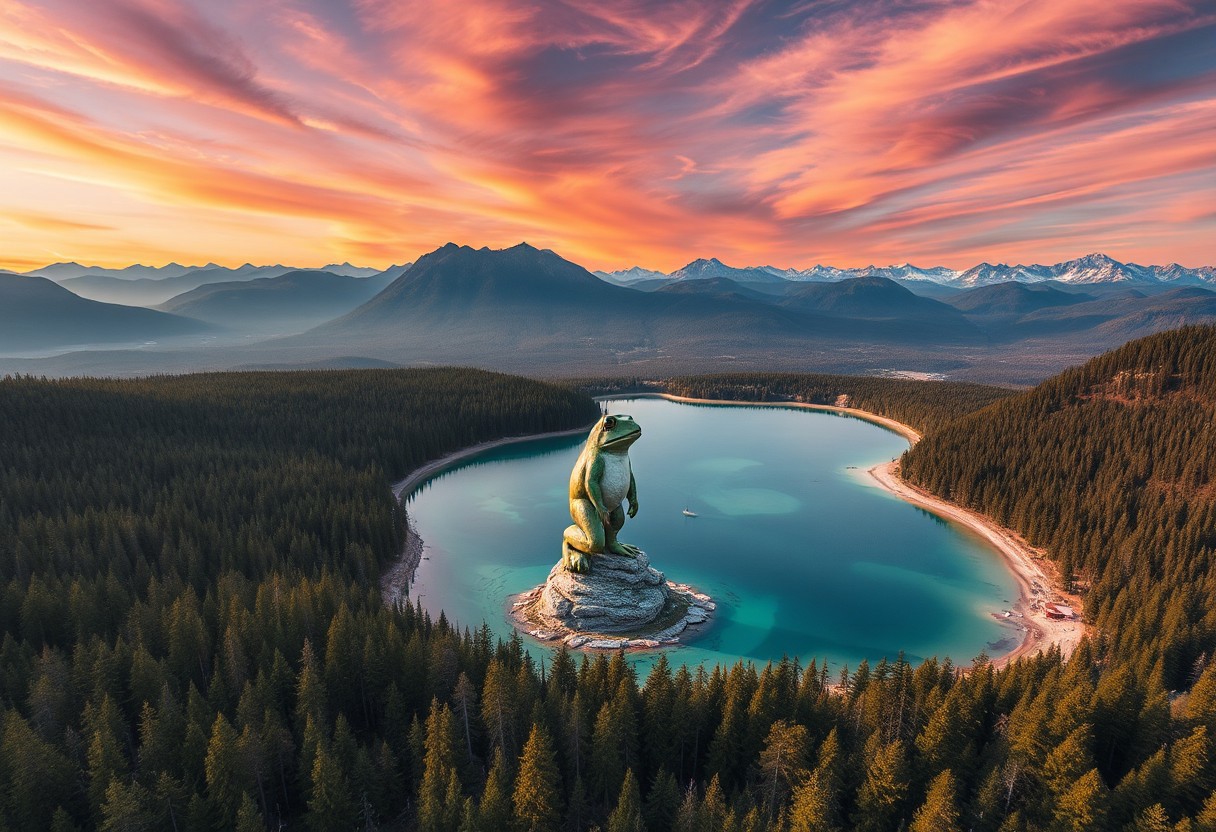 view from above, birds eye view, there is a forest and it reaches the horizon, on the horizon line are mountains, these mountains are tall and pointy, these mountains pierce the clouds, streams of clouds, swirling clouds, the sky is a beautiful blend of red, yellow and orange, in the middle of the forest is a crystal clear lake, there is a shore line around the lake that blends perfectly with the treeline and lake, in the middle of that lake is a frog statue, the frog statue is tall and clearly detailed, detailed image, high quality image, beautiful, contrast, masterpiece, high resolution