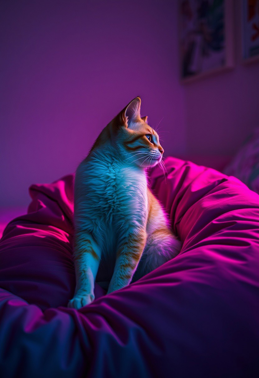 (Soft Lighting Photography by Mimoza Veliu and Mario Giacomelli:1.2), NSFW, A cat sitting in a large beanbag, magenta grunge, in profile, side view, surrealism, fashion illustration, bed room background, avant-garde, vivid colors, filigree, photorealistic rendering, moody chiaroscuro lighting