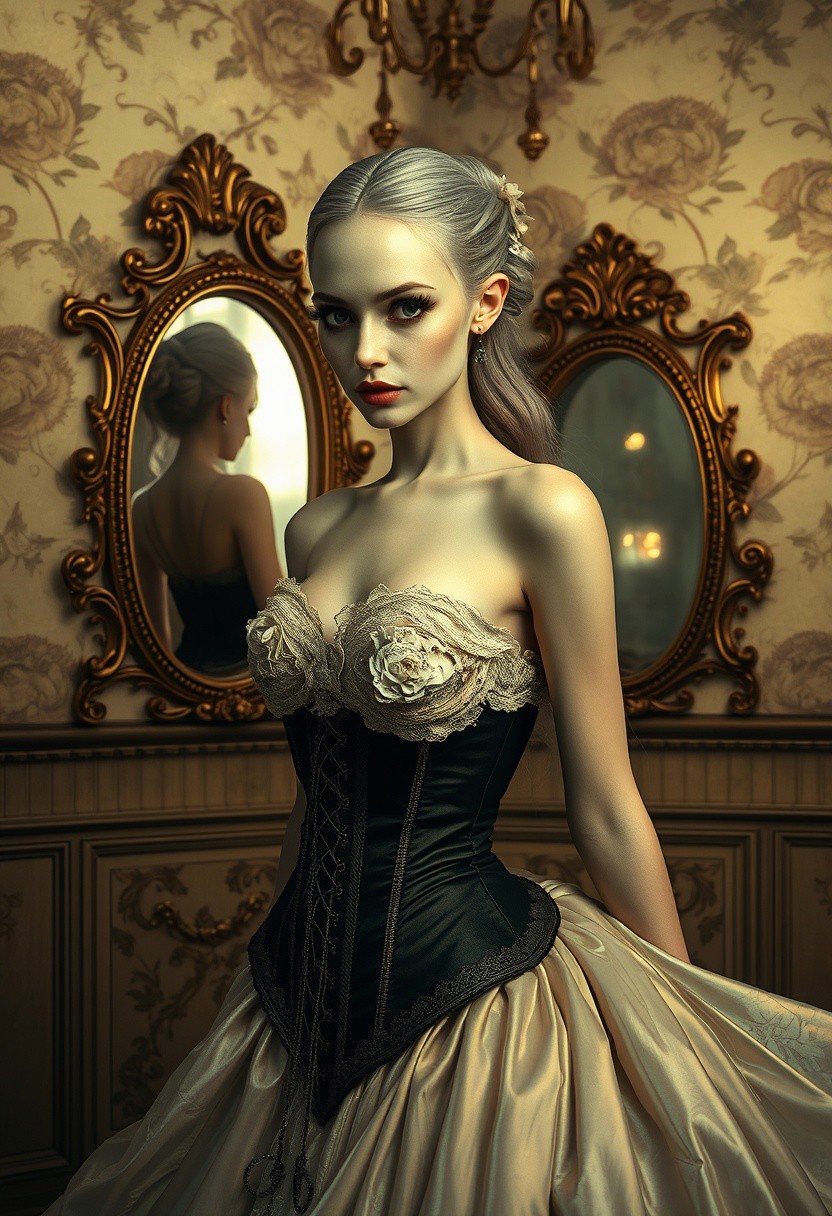 Victorian Surrealism , Victorian corset gown, surreal elongated proportions, antique mirror reflections, faded floral wallpaper, mysterious glowing artifacts, soft sepia and gold palette ethereal portrait, surreal beauty, elongated delicate features, large expressive eyes, porcelain-like skin, dramatic cinematic lighting, flowing iridescent gown, intricate fabric details, painterly fantasy background, swirling clouds, soft glowing lights, whimsical architecture, melancholic mysterious expression, rich jewel tones, soft pastel contrasts, gothic elegance, hyper-realistic textures, dreamlike storytelling