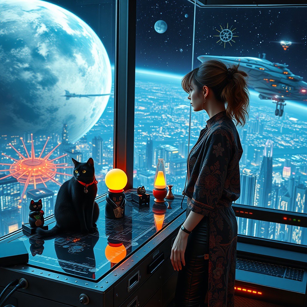 A sleek black cat with red collar sits on a cluttered metal riveted desk with transparent top and micro-LED lighted computer components visible inside, On the desk are a maneki neko statue and a lava lamp, the Black Cat is looking out of a seamless and futuristic floor to ceiling window that looks out at a planet from low orbit, the planet is covered with the lights of enormous buildings and cities, (((a beautiful woman, 24 years old, is standing next to the desk the cat is sitting on and looking longingly out the window, the woman is dressed in an ornate Japanese style shirt and tight leather-like pants. An enormous deco-cyberpunk starship with futuristic lighting and an enormous space station are visible in the background among the stars, The woman's hair is messy from just waking up and tied up with a ribbon. Artistic cyberpunk, dynamic perspective, (((overall architectural aesthetic is Art Deco Cyberpunk))). Epic image that elicits a feeling of wonder and awe,