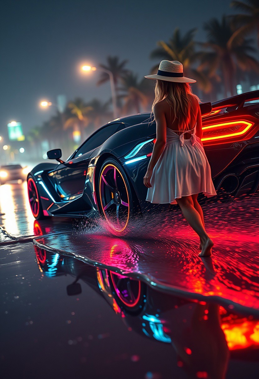 cybernetic style, sci-fi style, masterpiece, techno skin, score_9, score_8_up, cnovuschroma53 style A hyper-realistic close-up of the side view of a futuristic sports car with glowing wheels and lights, driving on wet streets at night, captured in high resolution, showcasing intricate details like reflections on its polished surface and neon lighting effects,VibrantlySharp style., VibrantlyDark style., blonde woman in sunhat and white summer dress, dark eyeshadow, walking towards viewer in shallow water on a coral sand beach, gentle waves, directional sunlight, palm trees, Hyperrealistic 24k uhd, <lora:124_novuschroma_a:1> ,<lora:epi_noiseoffset2:1> , <lora:EnvyDramaticLightingXL02_photo:1> ,<lora:EnvyElegance:1>,<lora:Ultima_Flux_v1:0,5>, <lora:SDXLFaeTastic2400:1>, <lora:sharp_eyes:1>, <lora:EyesWorld:1>, <lora:Sinozick_Style_XL_Pony:1>, <lora:last:1>, <lora:envyStarlightScifi_v10:1> <lora:aidmaFeetFix:1> <lora:envymix_v12:1>. futuristic, technological, alien worlds, space themes, advanced civilizations, lens flare , Hide