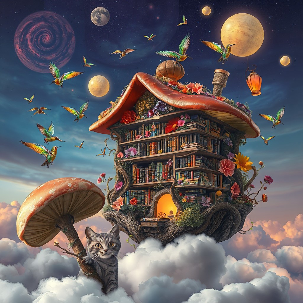 Create an image of a whimsical library floating in the clouds, where the books are made of vibrant flowers and the shelves are crafted from twisted vines. In the foreground, a curious cat with iridescent fur curiously peeks out from behind a giant, oversized mushroom. Above, the sky is a surreal blend of twilight colors, with swirling galaxies and oversized, glowing orbs resembling celestial lanterns. A flock of birds with kaleidoscopic feathers dances through the scene, casting rainbow shadows on the library below.