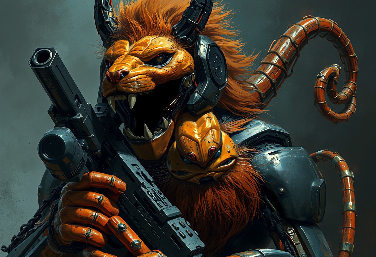 A high-definition, 8k resolution, pre-rendered, stylized painting of a cyborg Satan, inspired by Sam Black and Chaos Distillage, trending on Artstation, with an award-winning art style similar to Greg Rutkowski's dark art. The subject should be a close-up of a robot with a gun, featuring an anthropomorphic orange lion with a metal tail and blackness instead of eyes. The image should be color-corrected and free of watermarks, with a focus on threatening juxtaposition. Use a mix of dark art and science fiction elements to create a unique piece.