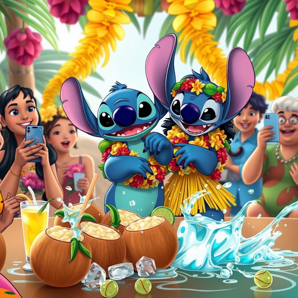 Create a humorous scene featuring Lilo and Stitch at a Hawaiian luau, but with a twist: Lilo is trying to teach Stitch how to hula dance. Stitch, in his usual clumsy manner, is tangled in a massive stack of leis and accidentally pulling down a whole tray of coconut drinks, which is splashing everywhere. In the background, the other characters from the movie, like Nani and Pleakley, are laughing as they capture the chaos on their phones. Add some vibrant tropical decorations and quirky facial expressions to enhance the hilarity of the moment