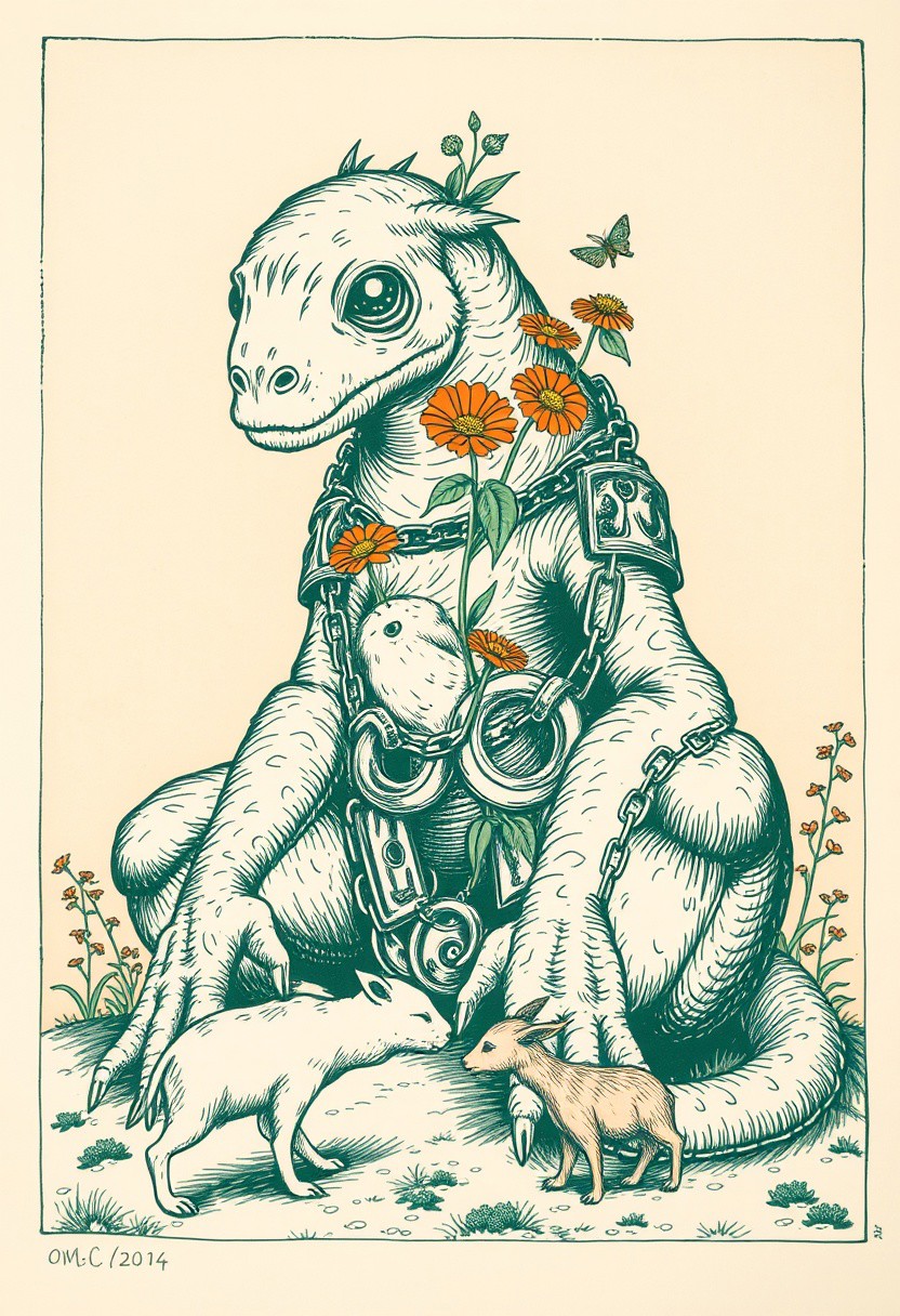 A screen print artwork in a green and orange bichromy. Inkstyle old engraving, paper texture, chained giant creature sitting looking down, plants and flower growing up in his body, curious animals sniffing near,