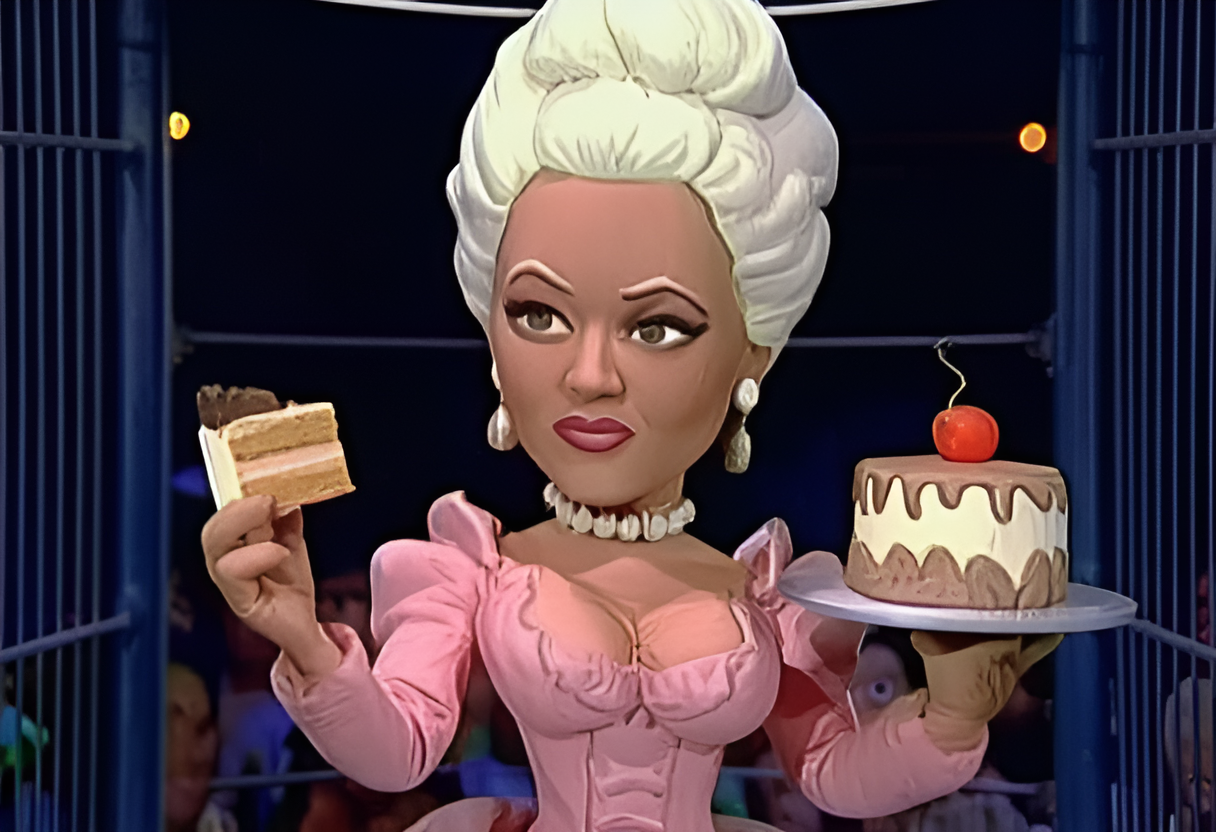 Marie Antoinette as a Celebrity Deathmatch character, with a white bouffant, wearing a fancy pink gown. She is holding a slice of cake. In a ring.