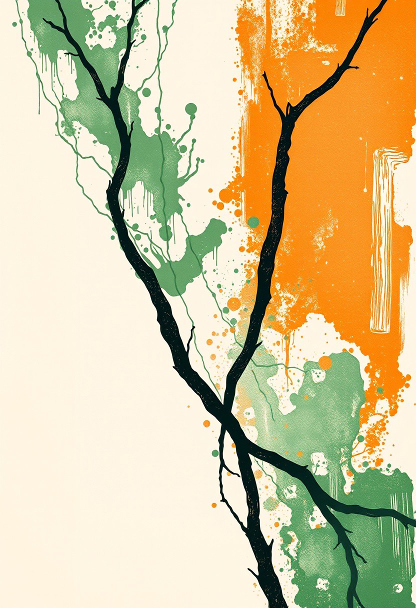 A screen print artwork in a green and orange bichromy. Inkstyle old engraving, paper texture.