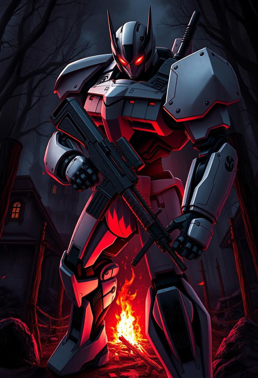 masterpiece, the palette is dark, with a predominance of red and black, the shadows are deep, the atmosphere is ominous,high-resolution, masterpiece, best quality, good quality, very aesthetic, absurdres, newest, 8K, depth of field, focused subject, in the style of cknc, artist:moriimee, in the style of cksc, BREAK 4-panel manga page, multiple views, asymmetrical panels, diagonal panel breaks, battle robot, robot joints, white plated armour, holding assault rifle, battle stance, dynamic angle, ancient fantasy city, directional lighting, detailed face, tattoos, photorealistic, UHD, shot on a Sony A7III, lighting. Posing very seductively. Taken from above behind, Gothic forest, night, bonfire, glowing eyes through the fog in the background,,<lora:epi_noiseoffset2:1> , <lora:EnvyDramaticLightingXL02_photo:1> ,<lora:Ultima_Flux_v1:0,5>, alien worlds, space themes, lens flare ,depts of field Hide