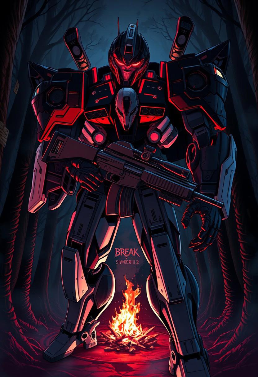 masterpiece, the palette is dark, with a predominance of red and black, the shadows are deep, the atmosphere is ominous,high-resolution, masterpiece, best quality, good quality, very aesthetic, absurdres, newest, 8K, depth of field, focused subject, in the style of cknc, artist:moriimee, in the style of cksc, BREAK 4-panel manga page, multiple views, asymmetrical panels, diagonal panel breaks, battle robot, robot joints, white plated armour, holding assault rifle, battle stance, dynamic angle, ancient fantasy city, directional lighting, detailed face, tattoos, photorealistic, UHD, shot on a Sony A7III, lighting. Posing very seductively. Taken from above behind, Gothic forest, night, bonfire, glowing eyes through the fog in the background,,<lora:epi_noiseoffset2:1> , <lora:EnvyDramaticLightingXL02_photo:1> ,<lora:Ultima_Flux_v1:0,5>, alien worlds, space themes, lens flare ,depts of field Hide