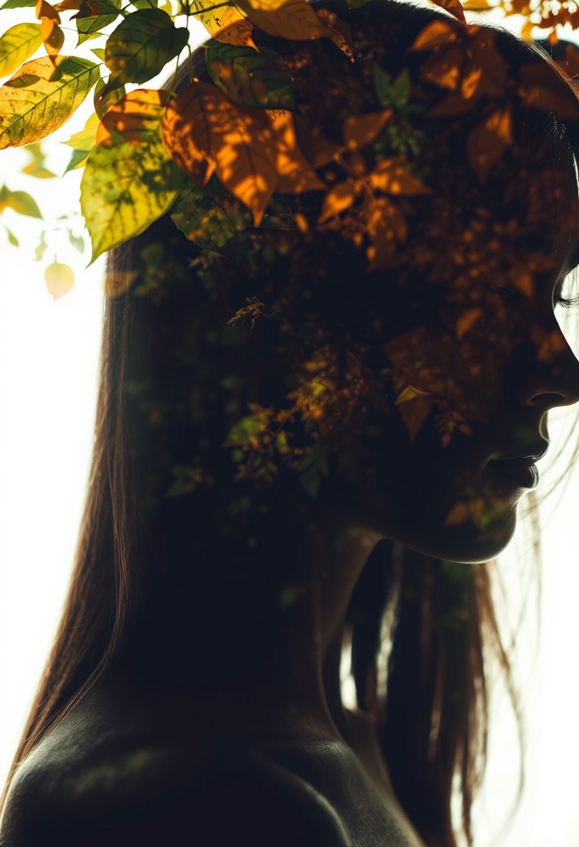 . Surreal Nature Double Exposure. Merge a portrait with forest elements using a Canon EOS 5D Mark IV and 100mm macro lens. Light the subject with soft, diffused daylight (f/2.8, ISO 100, 1/200s) against a white backdrop. Layer with a long-exposure shot of autumn leaves (f/16, ISO 50, 2s). Blend in post: translucent foliage overlays on the subject’s silhouette, emphasizing earthy greens and amber tones. Retain skin texture while adding moss-like patterns via masking.