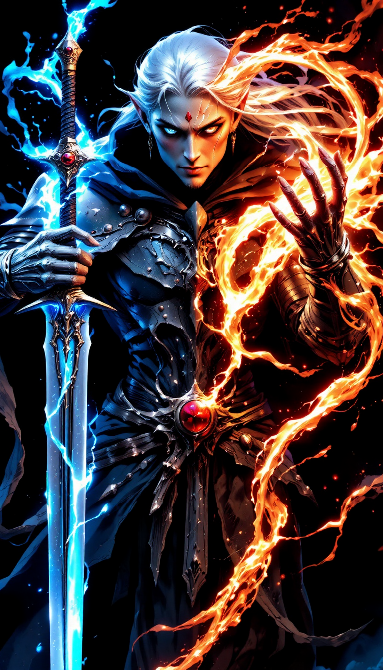 solo, score_9, score_8_up, score_7_up, score_6_up, hd, stunning scenario, realistic, wide angle, full body shot. A wide shot of a (male) drow elf with black eyes, square jaw, masculine traits, no beard, blue gray skin, and a long flowing silver hair. He wears a light dark with red details armor and golden greaves. He have glowing magic around him. The contrast between darkness and the neon blue and purple sets the scene. On one hand he holds a magic sword with electric energy and the other hand is full in red flames, with magic fire. The light effects from the spell reflect off his armor and the surrounding ruins, intensifying the arcane spectacle. embedding:badhandv4.pt embedding:easynegative.safetensors bailing_lightning, bailing_fire, mythp0rt, ArsMJStyle, DGC style, DNdGr41nyB0yz style