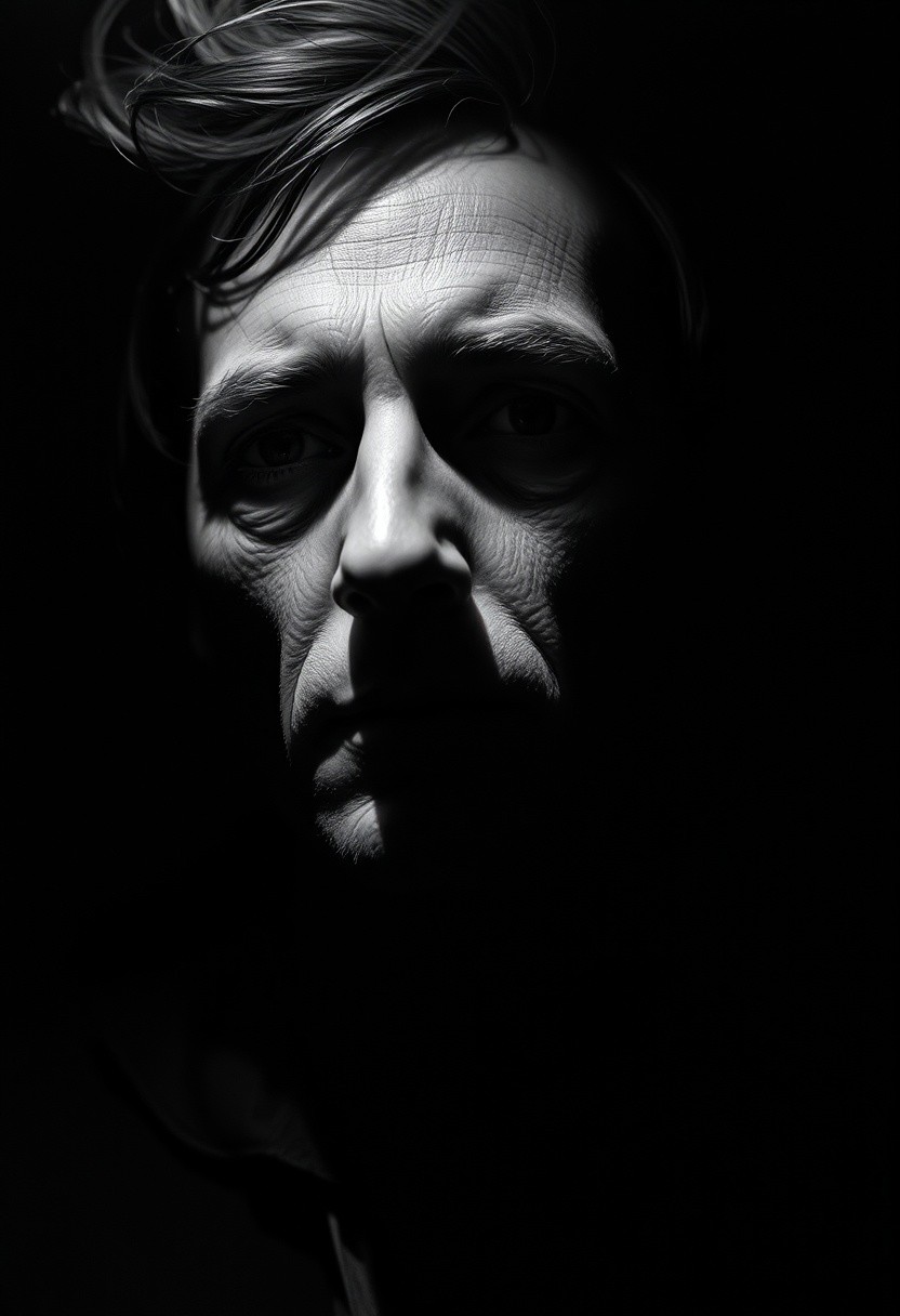 Capture a brooding, black-and-white portrait inspired by 1940s film noir. Use a Canon EOS R5 with a 50mm f/1.2 lens to achieve razor-sharp detail and shallow depth of field. Illuminate the subject with Rembrandt lighting: position a single tungsten spotlight at 45 degrees, casting dramatic shadows across one side of the face. Set aperture to f/2.8 for subtle background blur, ISO 100 for minimal grain, and shutter speed 1/125s. Enhance texture with chiaroscuro contrasts—highlight weathered skin pores and a smoke-filled atmosphere. Post-process with silver toning and subtle film grain for authenticity.