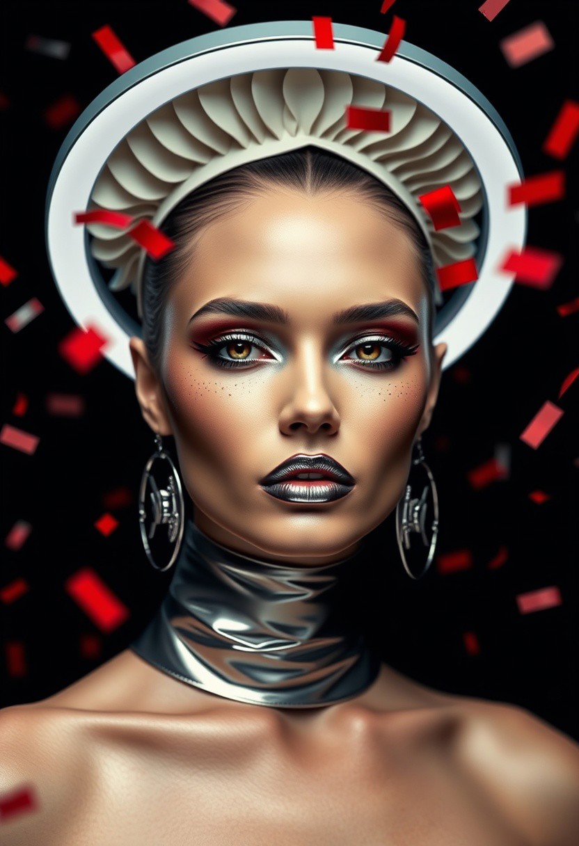 High-Fashion Editorial. Shoot a bold, minimalist portrait with Phase One XF IQ4 and 80mm f/2.8 lens. Use a ring light for even illumination and a honeycomb grid to highlight angular features. Set f/8 for full-face sharpness, ISO 50, 1/125s. Style with metallic makeup and avant-garde headpieces. Freeze motion with a burst of confetti (1/1000s). Post-process with hyper-realistic clarity, boosting saturation on red accents against a matte-black background.
