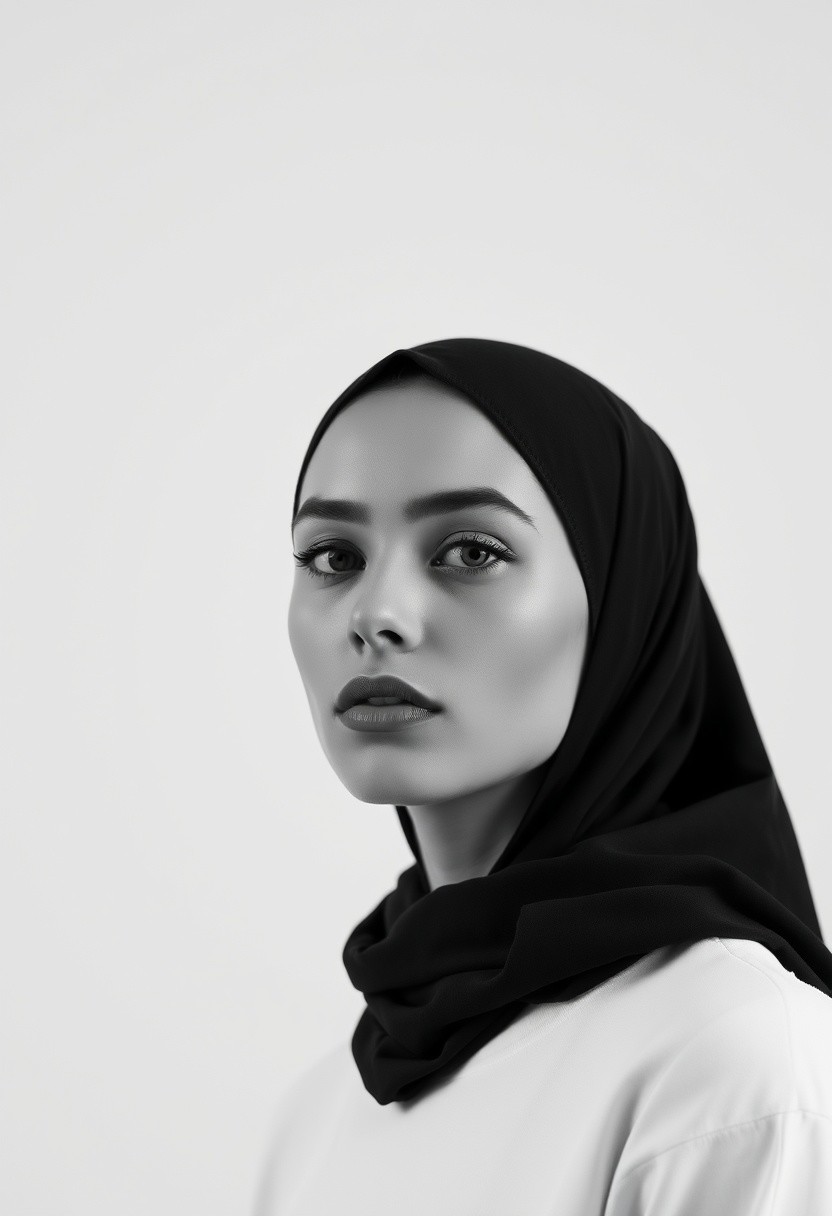 Monochrome High-Key Minimalism. Achieve stark contrast with a Sony A1 and 90mm f/2.8 G lens. Use three softboxes for shadowless illumination against a white cyclorama. Set f/11, ISO 50, 1/200s. Focus on geometric facial symmetry and bold accessories (e.g., black headscarf). Post-process to pure B&W, amplifying micro-contrast and clipping whites for a sterile, modern aesthetic.