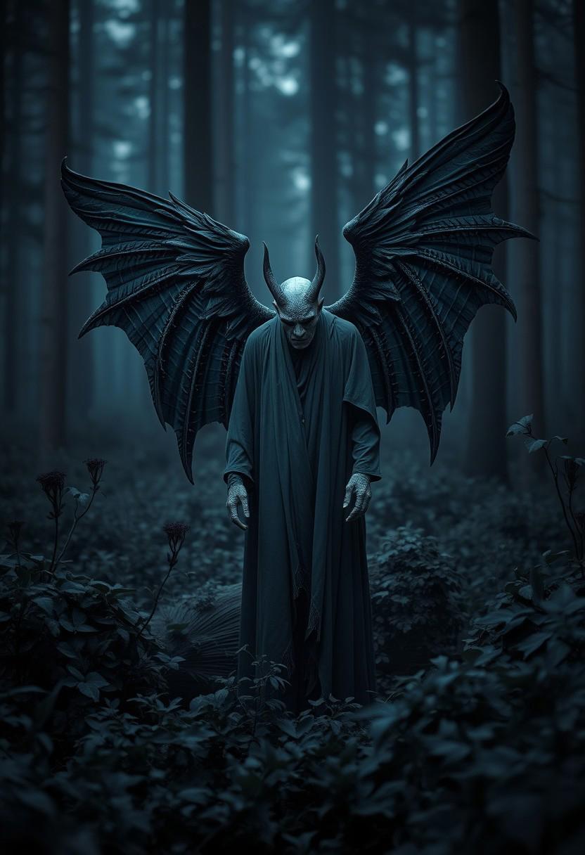 high-resolution photograph featuring a demon that has large, black angel wings that are covering its body and wearing a long, flowing torn cloack robe and has long, pointed horns on their head in an ethereal, forest setting. the figure stands amidst a dense undergrowth of dark, almost black, foliage and plants, creating an eerie, mystical atmosphere. The background is a dense forest with tall trees that are blurred and out of focus, contributing to the dreamy, almost surreal quality of the image. The overall color palette is dominated by deep blues and purples, enhancing the mystical, magical ambiance.