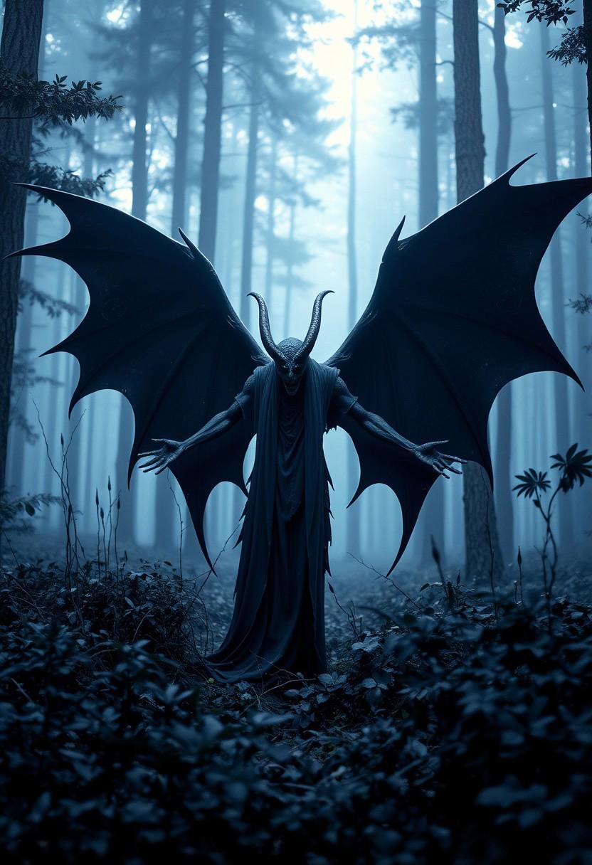 high-resolution photograph featuring a demon in an ethereal, forest setting. this demon has Enormous black wings that cover up its whole body, the figure wearing a long flowing torn balck cloack and has long, pointed horns on their head with its arms stretched out to the sides, the figure stands amidst a dense undergrowth of dark, almost black, foliage and plants, creating an eerie, mystical atmosphere. The background is a dense forest with tall trees that are blurred and out of focus, contributing to the dreamy, almost surreal quality of the image. The overall color palette is dominated by deep blues and purples, enhancing the mystical, magical ambiance.