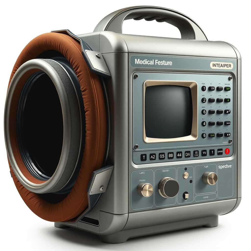 A front view of a strange medical device, on the left is of the device is an cylindrical opening lined with a padded material, the casing of the device is metallic and various buttons and a single CRT display on it, depicted in a photorealistic style.