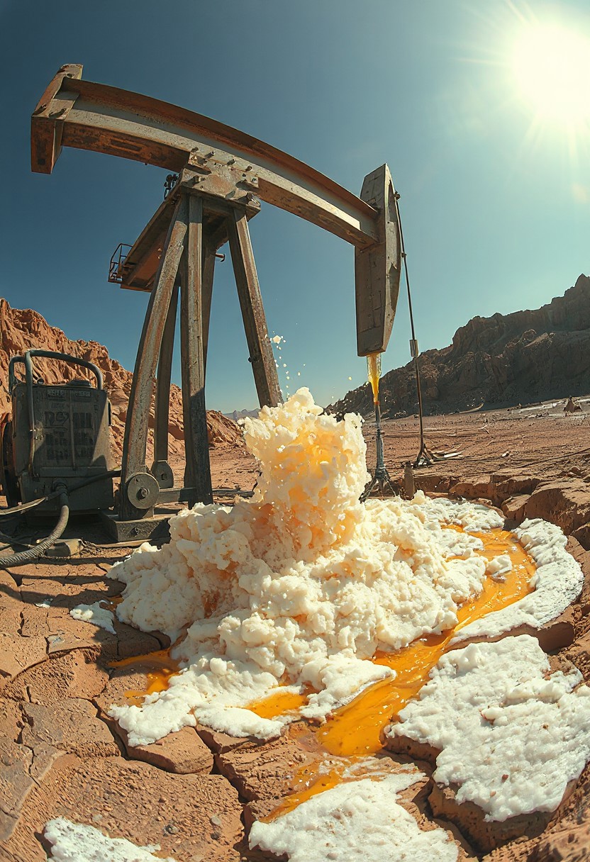 “A massive industrial oil extraction pump working tirelessly in a rugged desert landscape. Instead of crude oil, golden frothy beer erupts from the pierced ground, splashing chaotically under the scorching sun. The scene is surreal, with foamy rivers of beer flowing through the cracked earth, reflecting warm amber hues. Shot with an extreme 12mm fisheye cinema lens, creating a dramatic distorted perspective—curved horizon, exaggerated depth, and an immersive wide-angle view. The pump’s metallic arms glisten with condensation, while beer droplets catch the sunlight in cinematic brilliance. Ultra-detailed, hyperreal textures with a painterly touch, deep contrast, and dynamic lighting.”