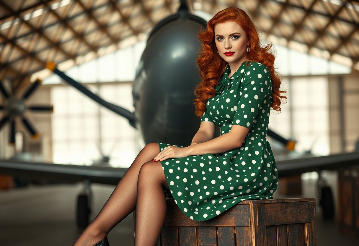 score_9, score_8_up, score_7_up, RAW, masterpiece, full body, photorealistic, noir_style, 1girl, beautiful young woman, 30 years old, redhead, long hair, wavy hair,sitting on a wooden crate in an old hangar, 1940's noir, elegant, Wearing green and white polka-dot 1940s dress with padded shoulders, nylon stockings, low heels. looking at viewer, high details, highly detailed, sharp focus, beautifully detailed woman, detailed eyes and face wearing 1940s style dress with padded shoulders detailed background, 1940s airport hangar, 1940s era airplane