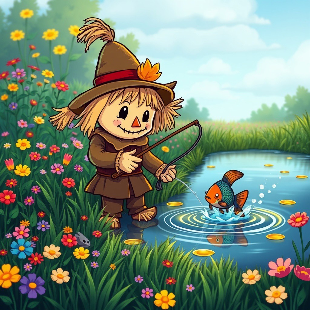 A cute scarecrow fishing at the pond, Surrounded by A dense crop field colorful flowers scattered all around, a colorful fish jumps out of the pond creating a small splash, colorful scene with natures creatures lurking about, vibrant glow,cartoon,chibi